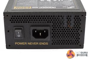 The other side of the power supply has the power button, power connector and vented panel to help with air flow. The slogan ‘POWER NEVER ENDS' can be seen here. We hope this means the power switch works after you turn it off!?