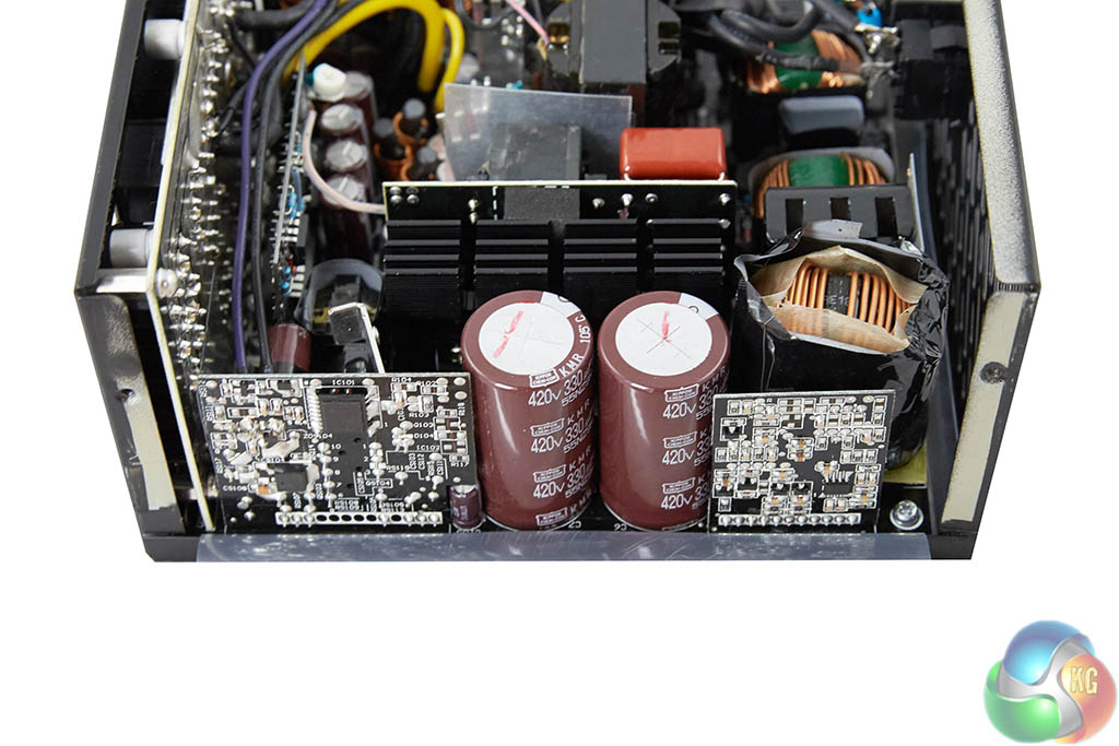 FSP are using a pair of high grade 105c rated Japanese capacitors on the primary stage – both rated 420 V 330uF. These are from the KMR range. On the main PCB we found standard electrolytics from Rubycon and Nippon Chemi Con. I was a little disappointed to see a few solid capacitors on the main PCB from Chinese company TEAPO.