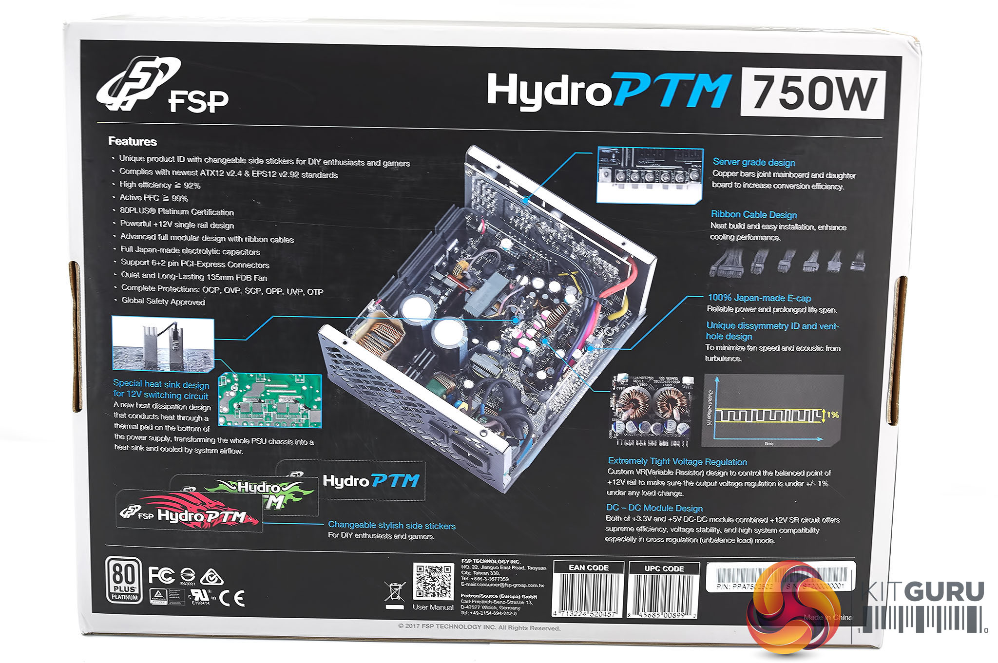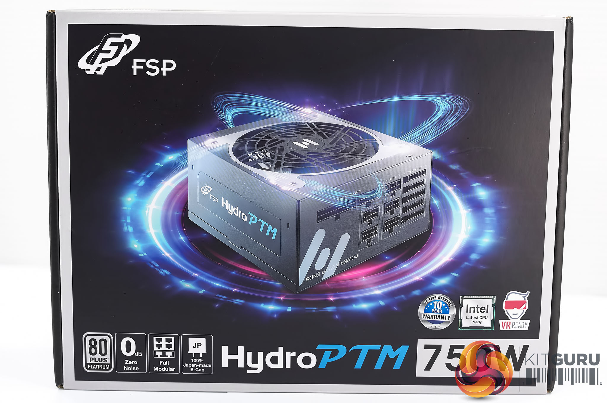 The FSP Hydro PTM 750 watt power supply arrives in a fancy looking box with the power supply itself surrounded by fancy aura lighting. The Platinum efficiency, Japanese capacitors and fully modular design are highlighted on the front of the box.