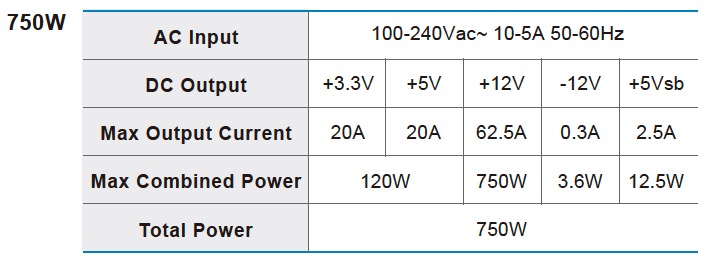 The power supply delivers 20A across the +3.3V and +5V rails and 62.5A via the +12V rail.