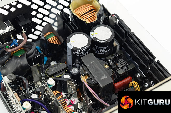 Inside I was happy to see 105c Japanese capacitors used throughout – its hard to go wrong with either Nippon Chemi Con or Rubycon, as featured in the PTM supply. The overall internal build is clean and neat throughout and the big fan copes with the cooling well.