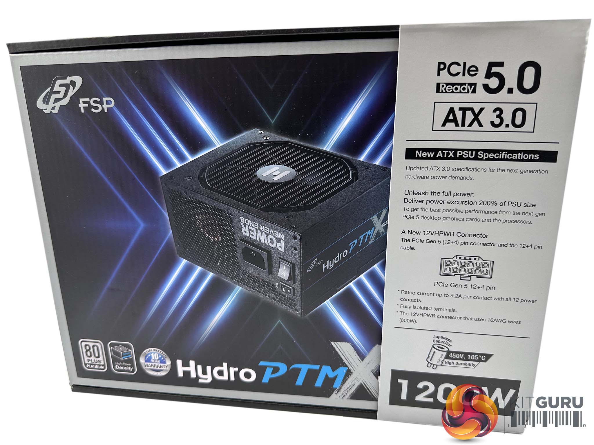 The power supply ships in a large box with a lot of information down the right side and a high resolution photograph of the power supply on the left.