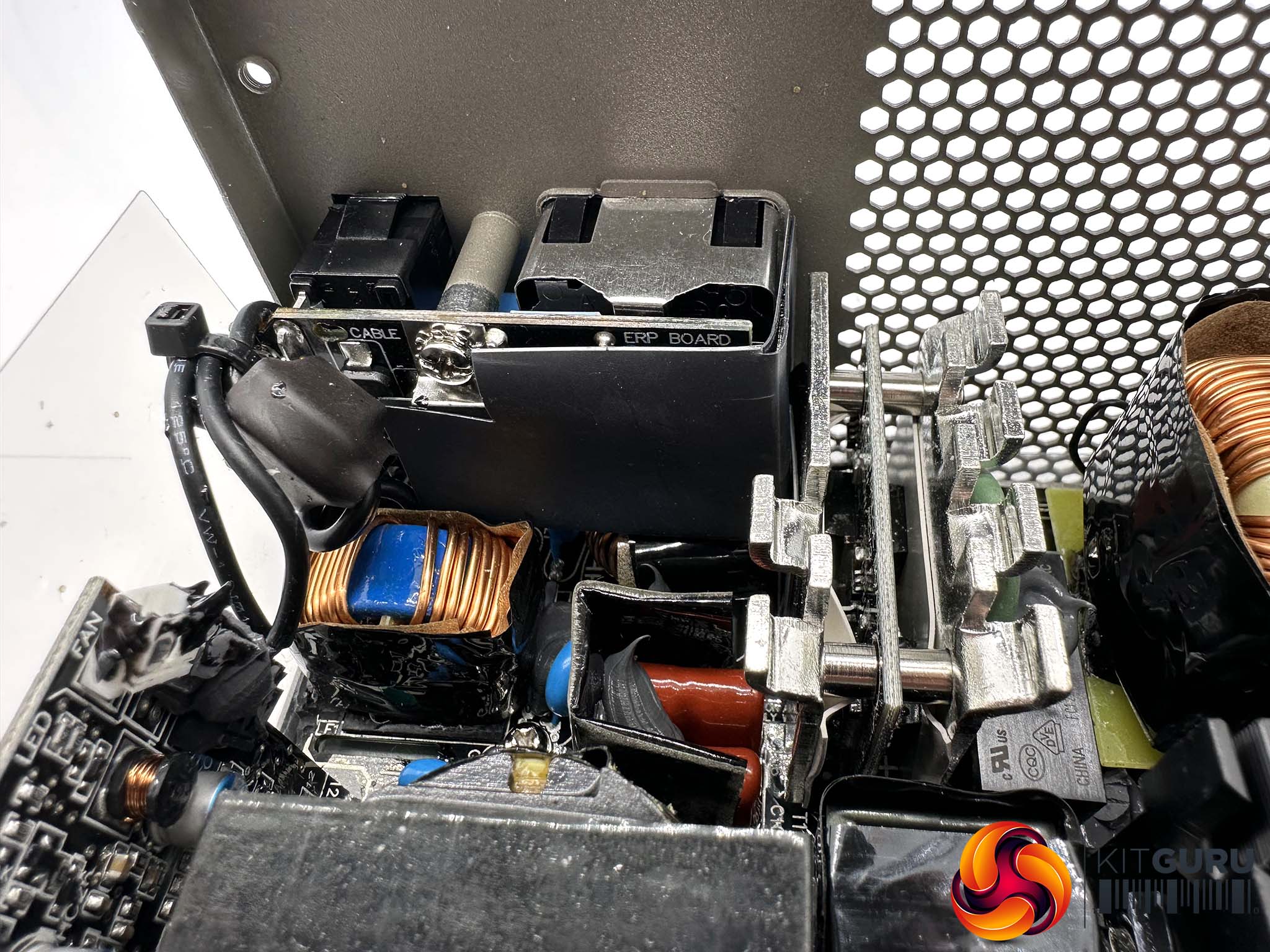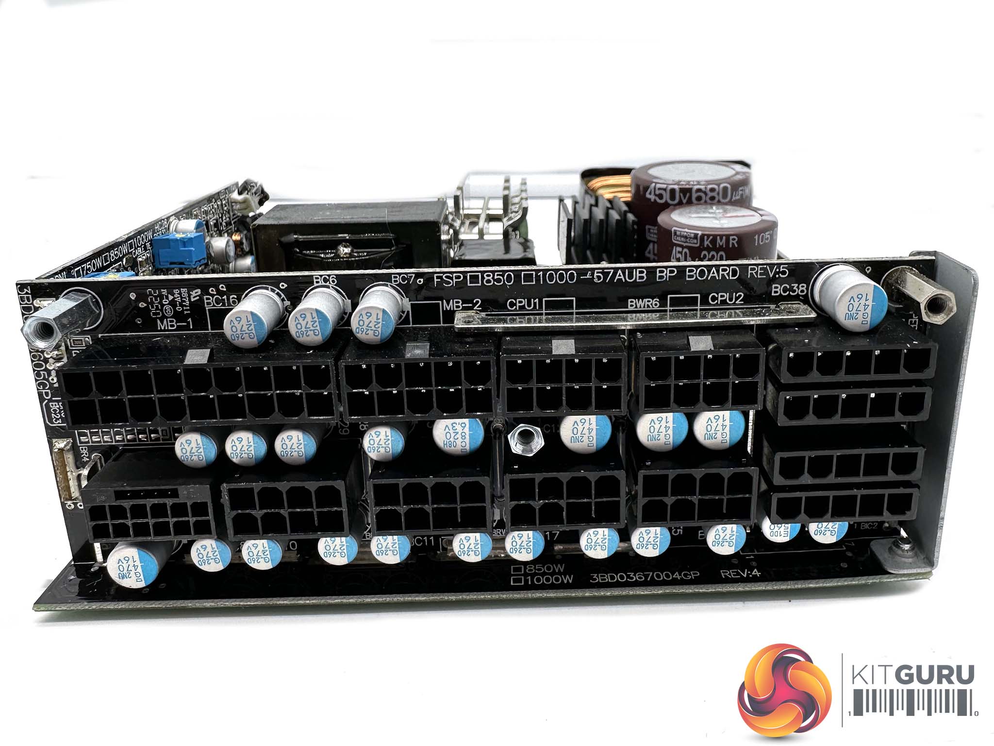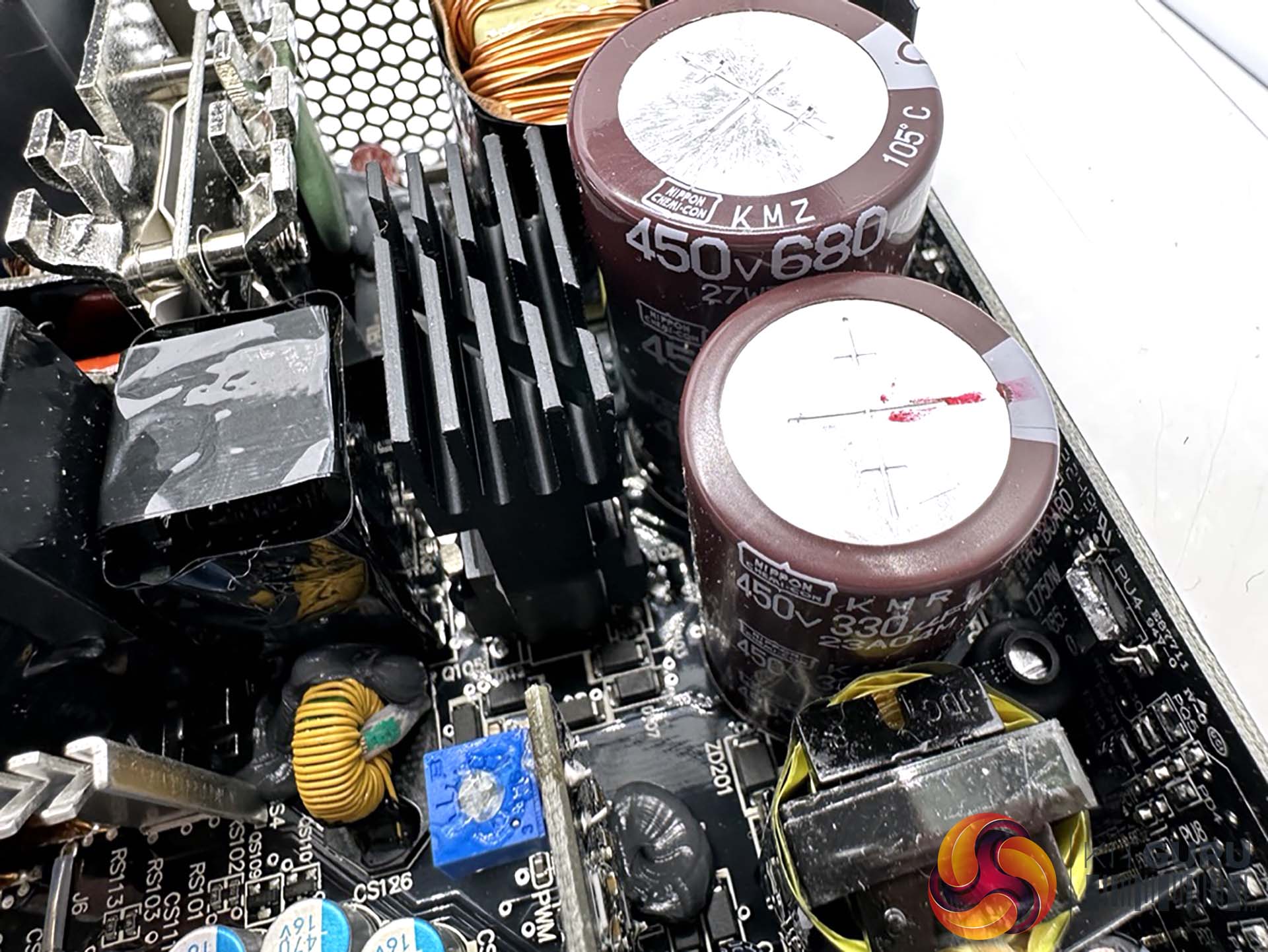 FSP are using two high grade 105C rated Japanese capacitors from Nippon Chemi Con. The two caps are 450V : 330uF (KMR series) and 680uF (KMZ) rated for a total of 1010uF.