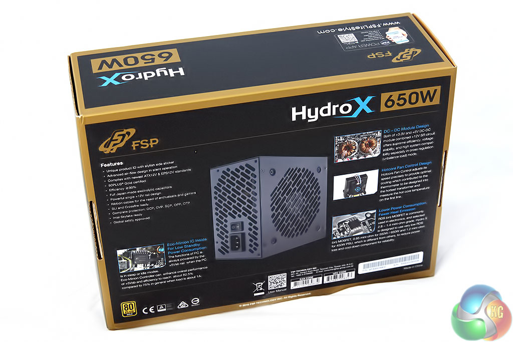 The FSP box artwork is almost identical to the Hydro G series unit we tested back in December 2015. The artwork is dark, with gold accenting on the edges and a photograph of the unit in the center. Some of the key selling points are listed along the bottom – such as 80 Plus Gold Certification, the DC to DC design and Japanese Caps.