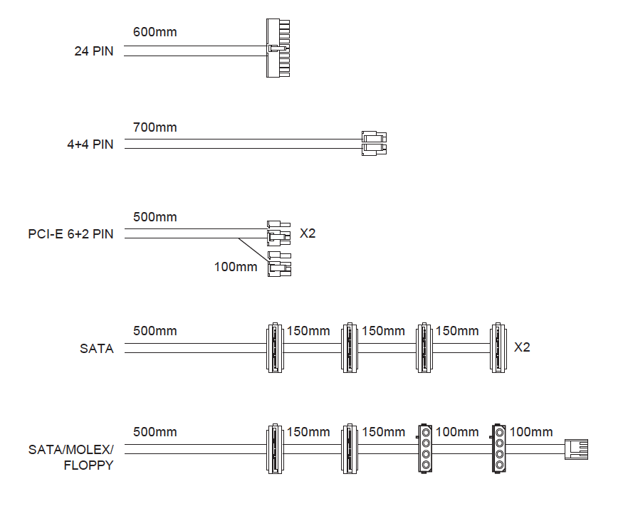 Above, a breakdown of the cable configuration, as well as the lengths. The X 650 has support for single and dual graphics cards configurations with 4 x PCIE 6+2 pin cables.
