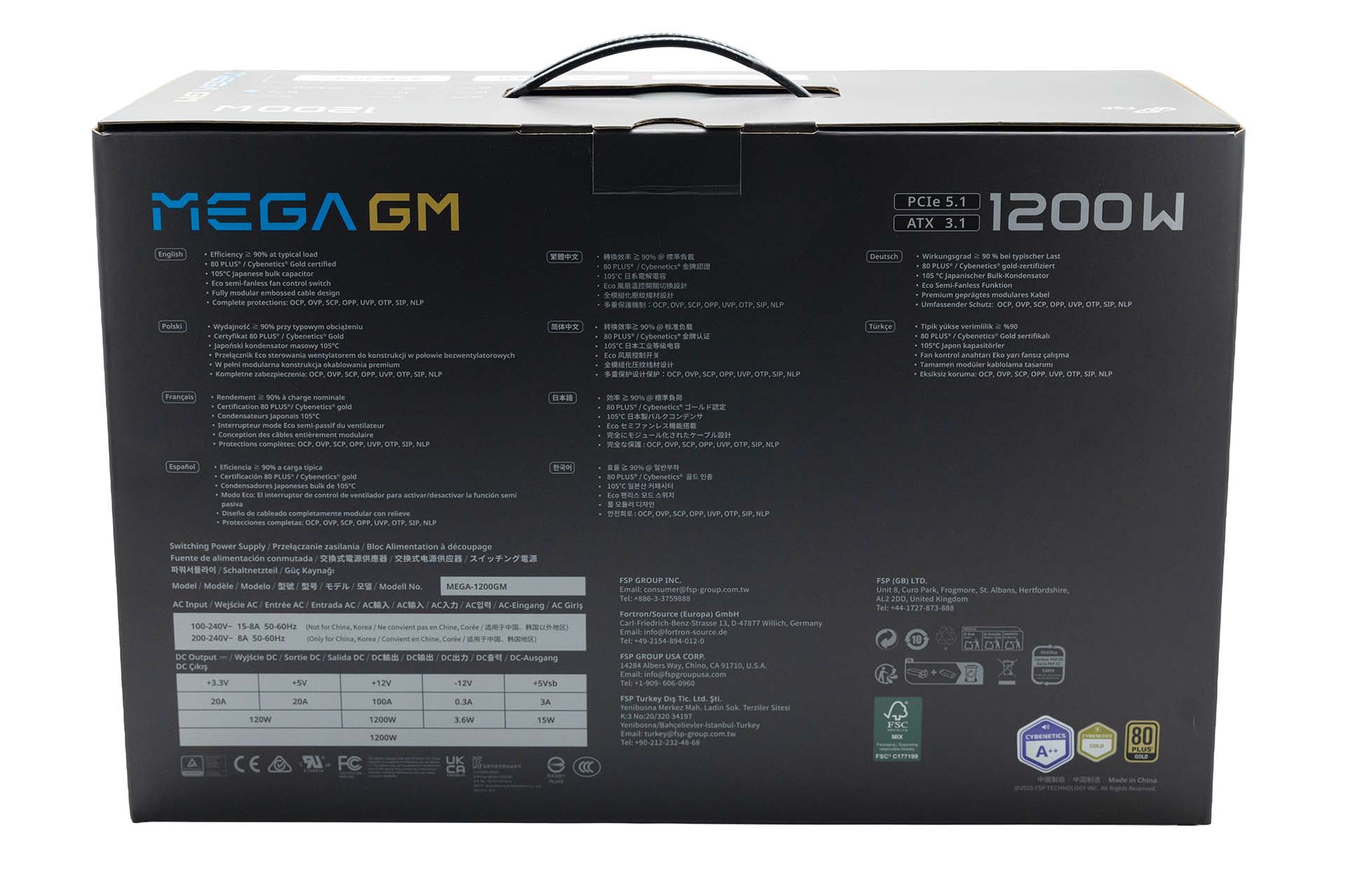 The Mega GM 1200W ships in a nicely designed box, with key specifications (PCIe 5.1/ATX 3.1) and certifications on the front, alongside a high-resolution image of the unit in the middle. Always good to see Cybenetics awards getting featured as they mean more in 2026 than 80 Plus.