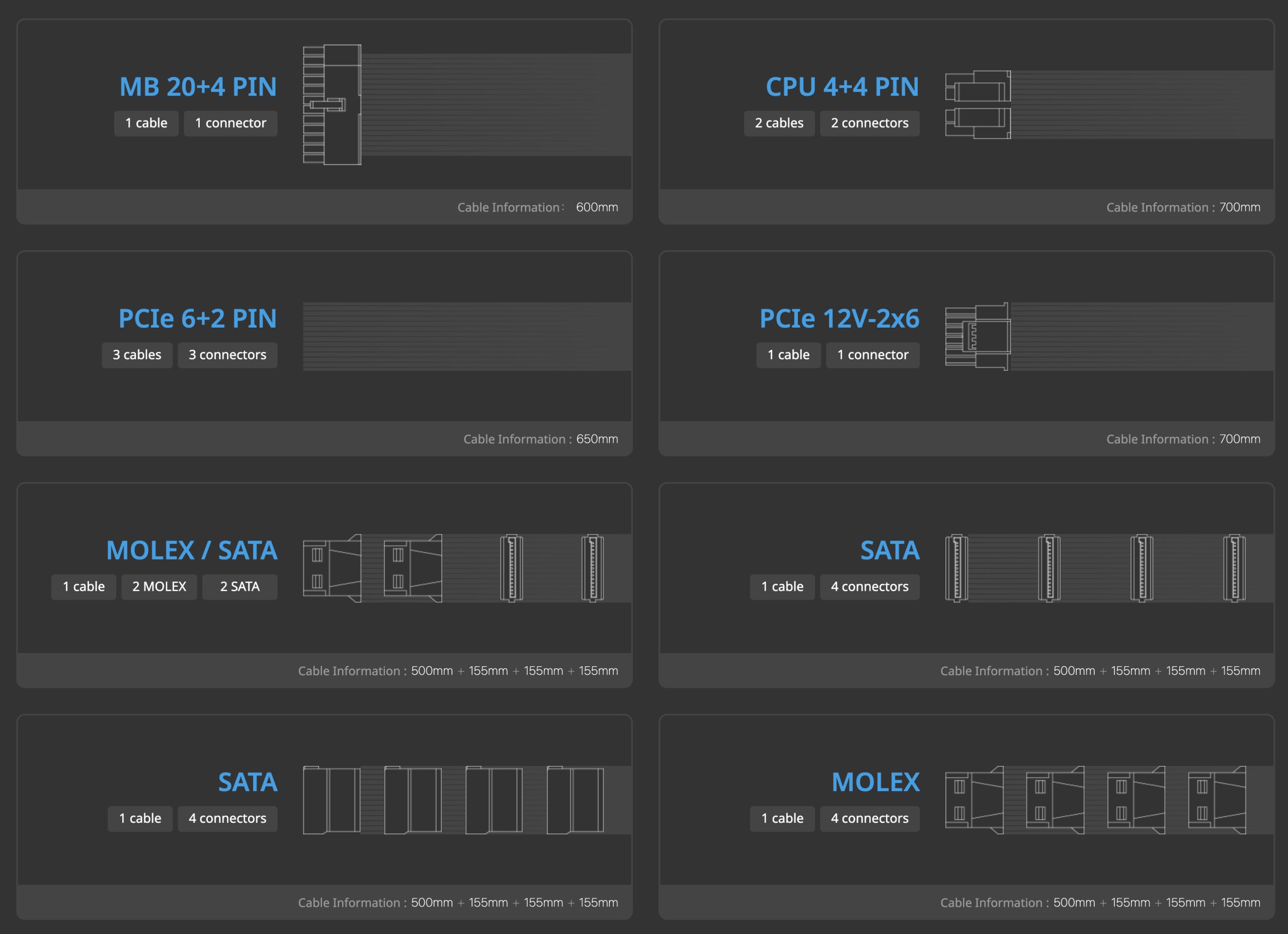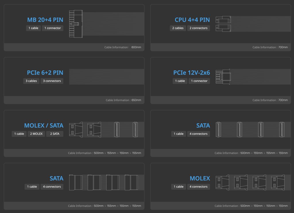 The cables are all individually sleeved, high quality and there are plenty to cover all the bases you would expect with a 1200W unit. SATA cables are 18 AWG gauge, and the 4+4 Pin and 6+2 PIN PCIe cables are 16 AWG gauge. The 12+4 Pin PCIe 600 watt cable is 16-24 AWG.