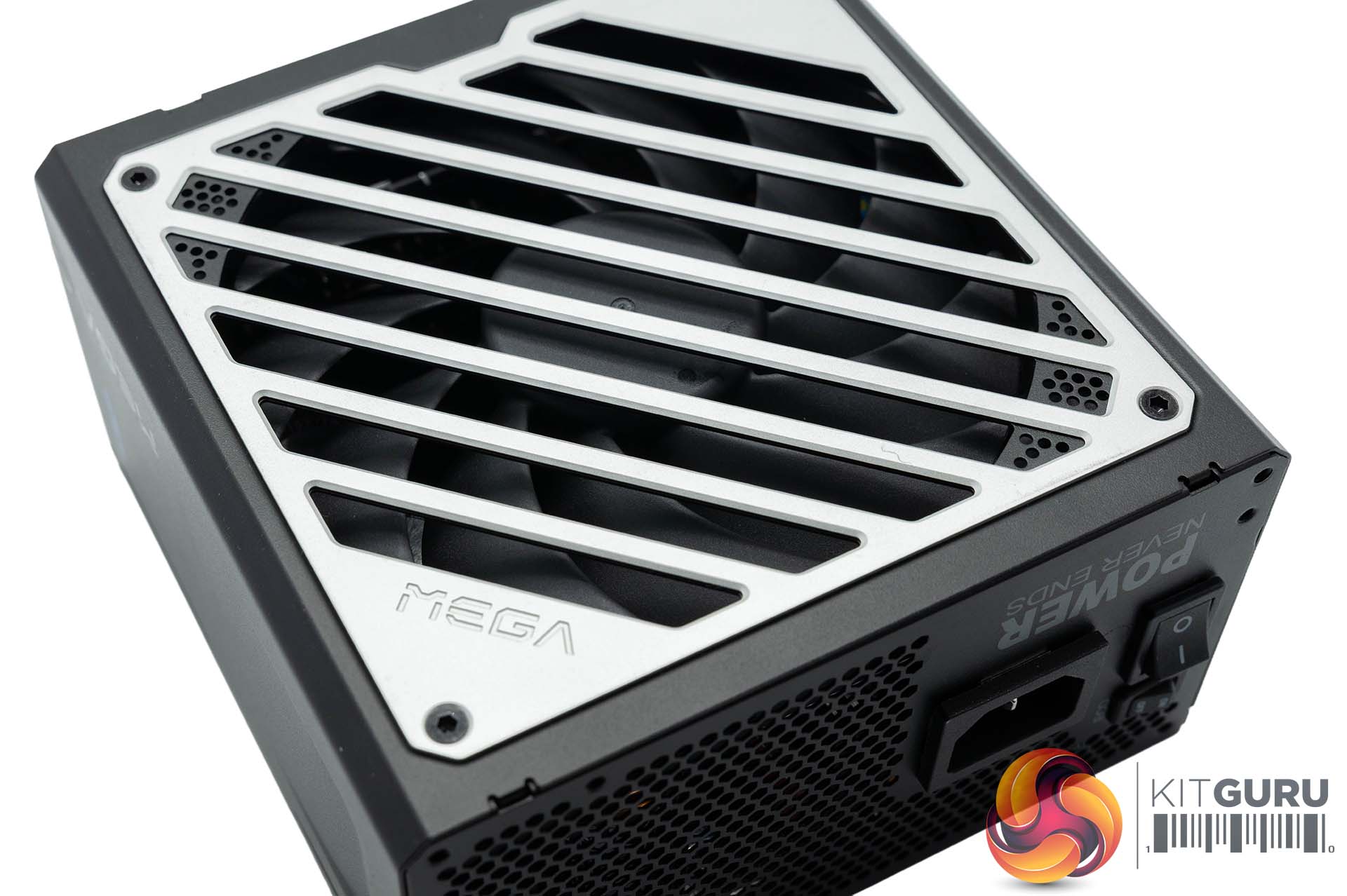 The top fan shroud is accented in silver with the ‘Mega' branding in the corner. Large vents ensure high levels of airflow are possible.