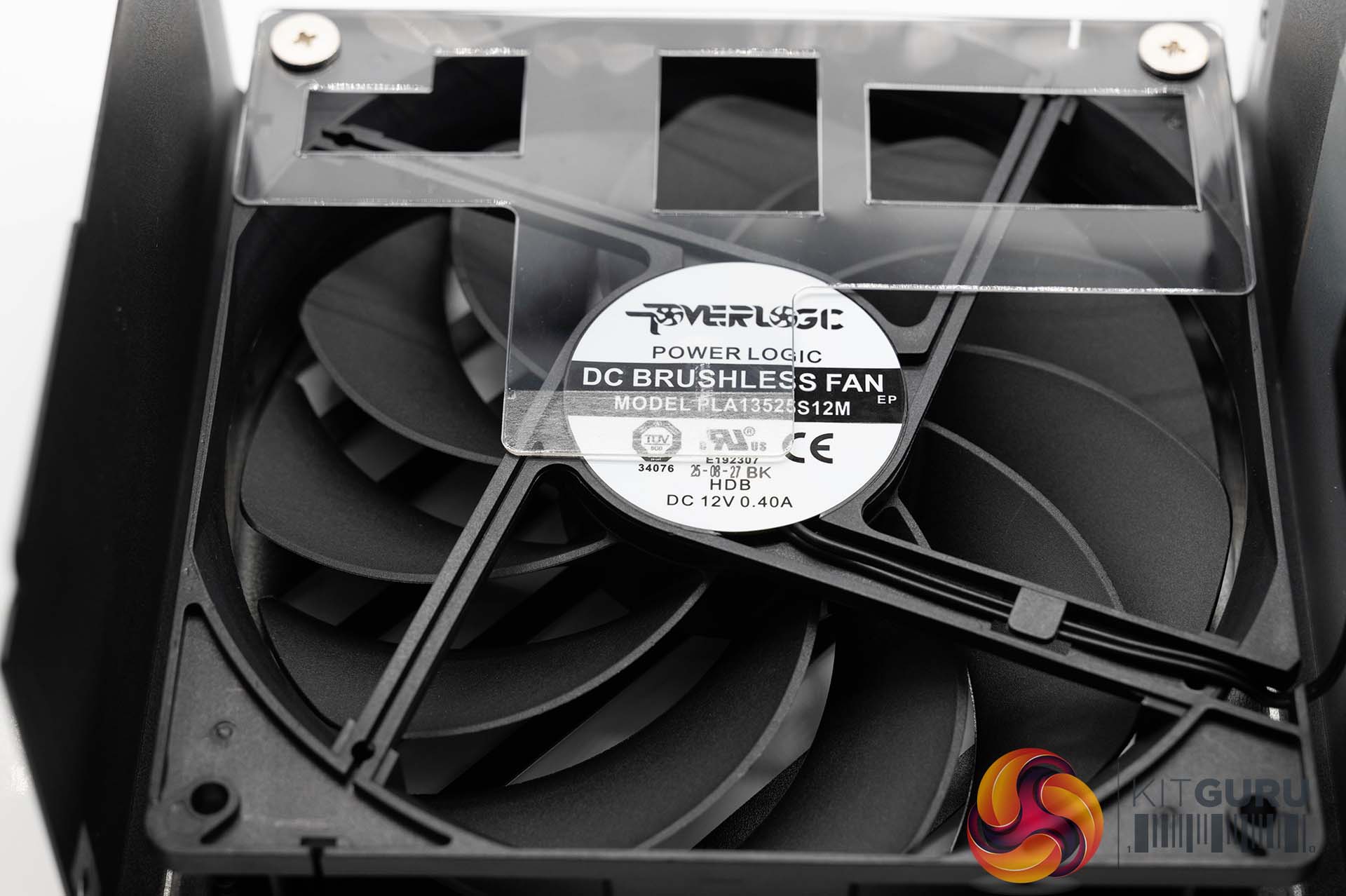 The fan inside is a Power Logic model PLA13525S12M, fluid dynamic bearing, DC 12V 0.40A. This 135mm fan is rated to deliver around 111 CFM airflow with a noise rating around 41.6dBa. It has featured in other power supplies from the likes of be quiet!