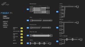 Both 1350 w and 1650 w versions of this power supply ship with a tremendous amount of cables to cover every eventuality we can think of. FSP also supply two EPS connectors and eight PCIe connectors. Additionally, they bundle a pair of 12V-2×6 cables to deliver 600 watts per cable.