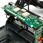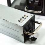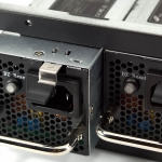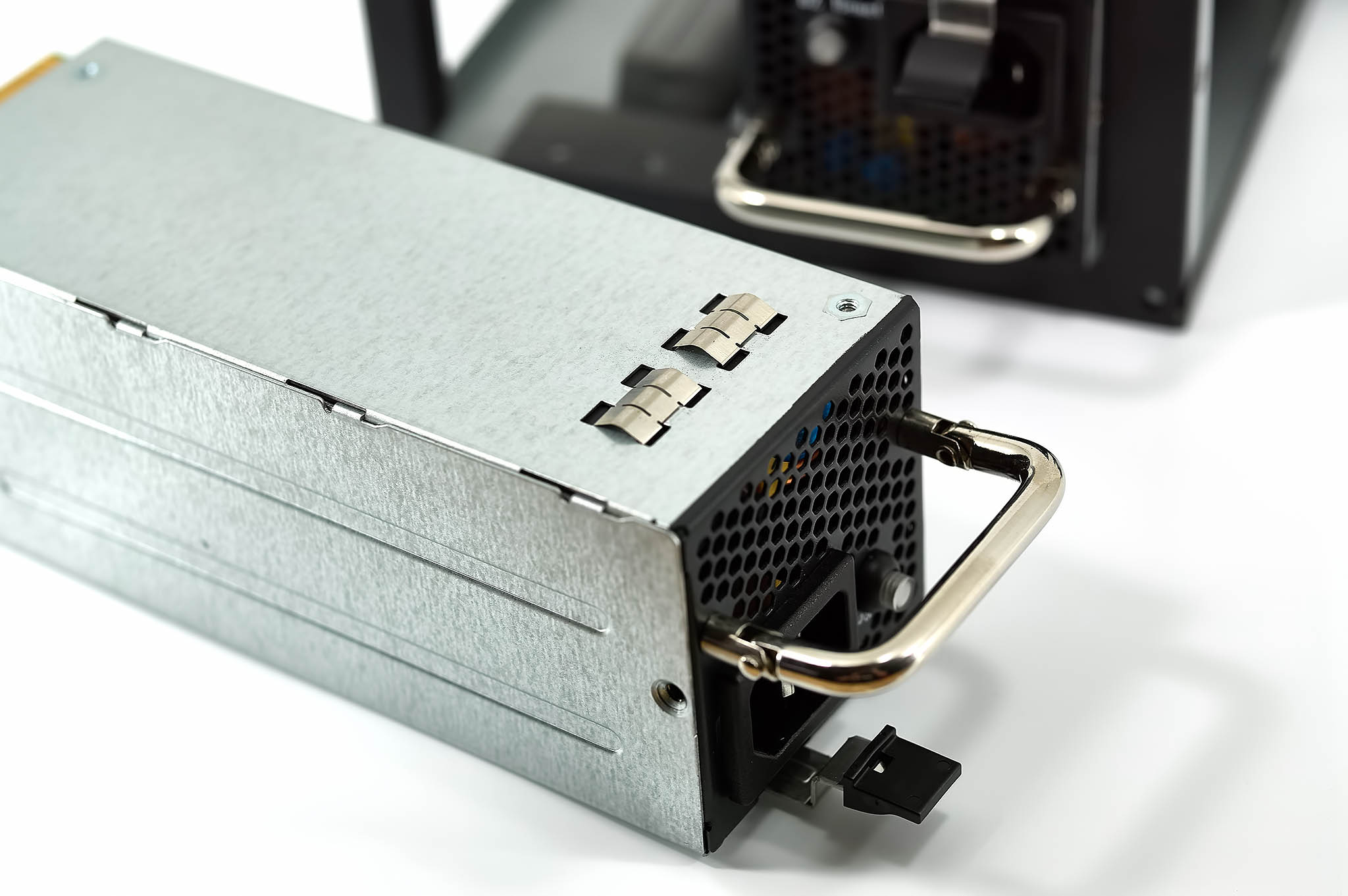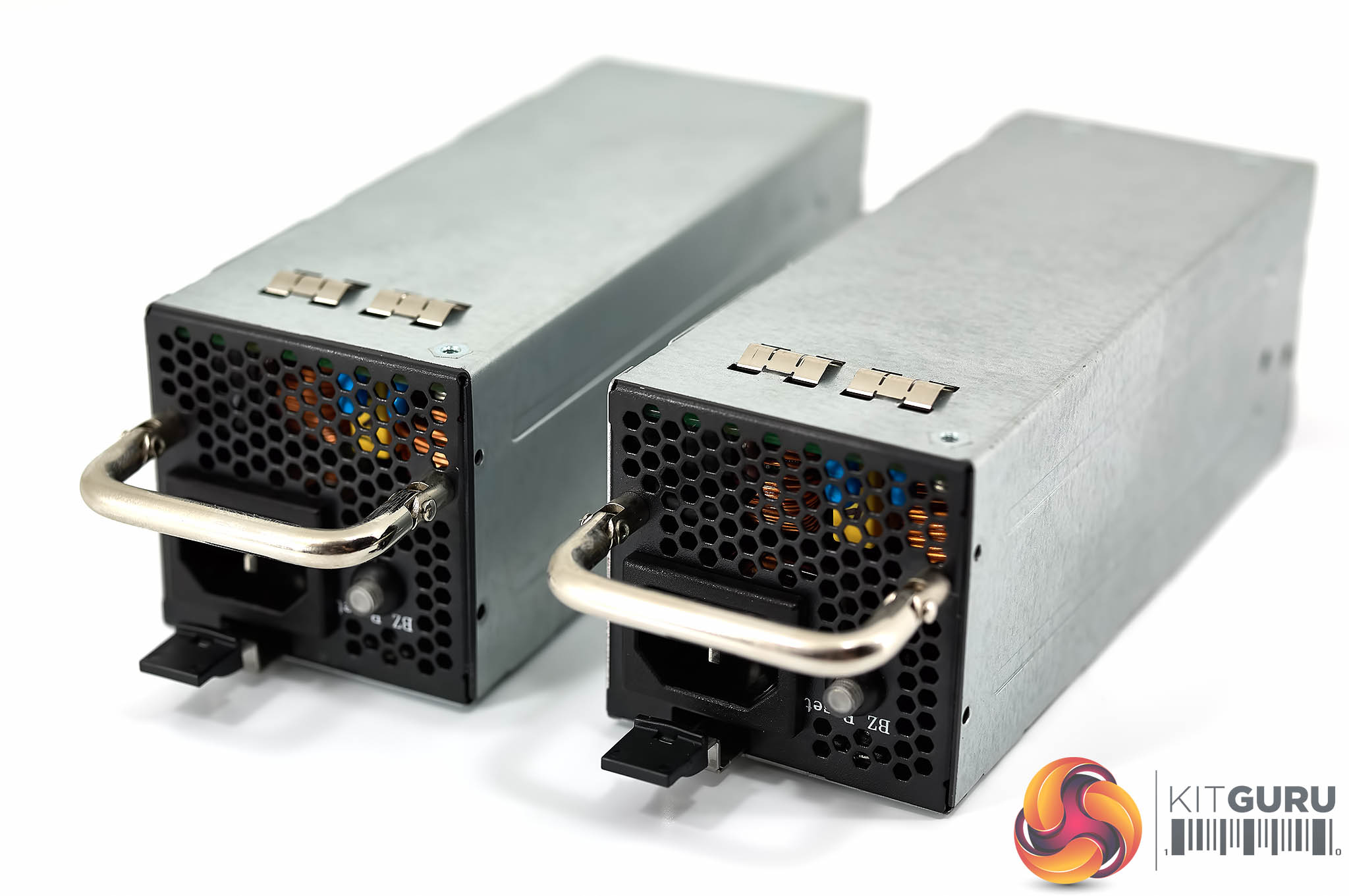 Each of the power supplies is long and thin without any paintwork on the chassis. One side has a vent and a handle, as well as a locking pin row. The other side of each power supply has a fan attached to ensure there is enough air flow.