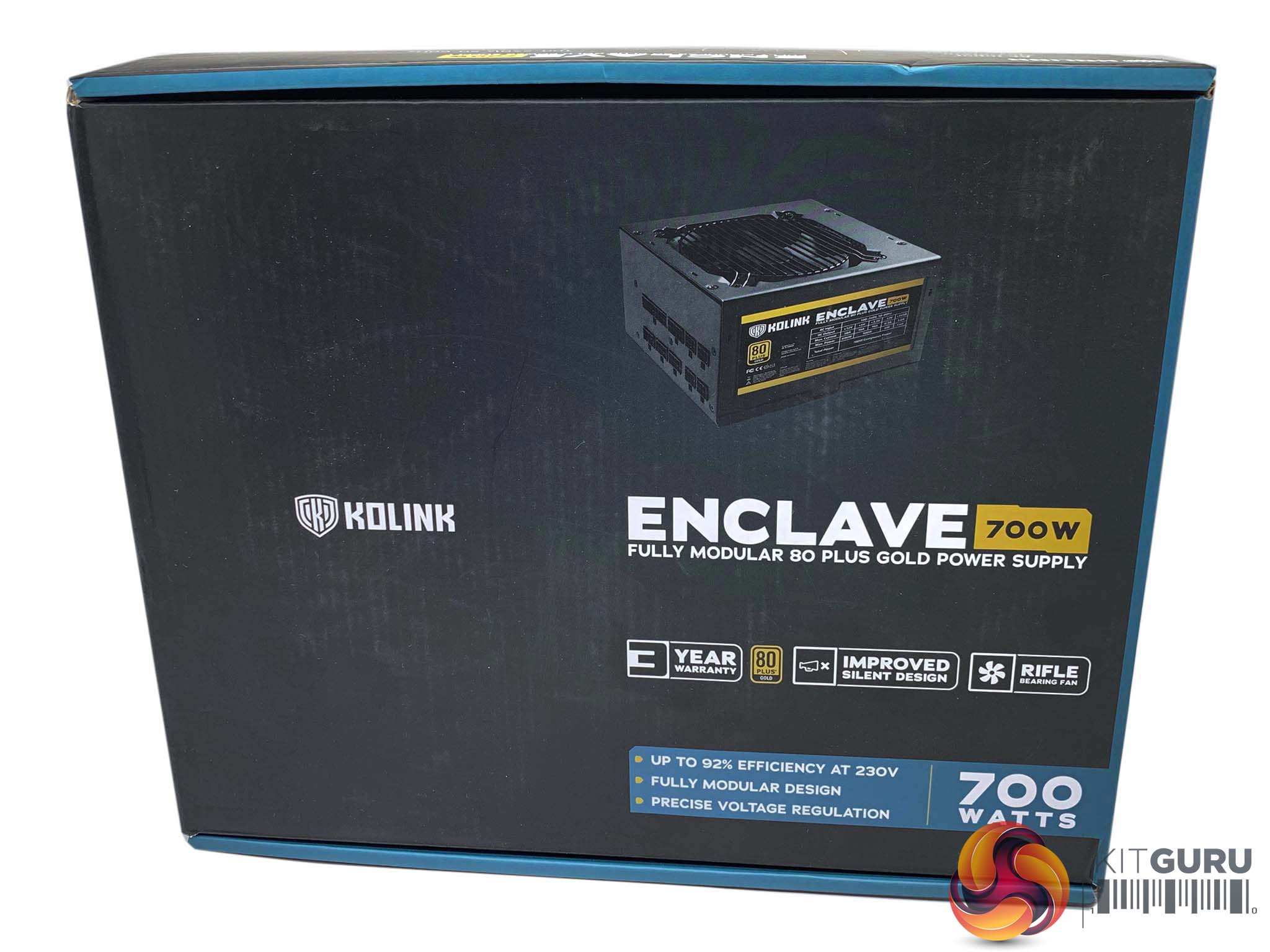 The Kolink box artwork for the Enclave is quite effective and rather subdued. They have opted for a nice selection of fonts, and some key selling points on the front of the box – such as the 3 year warranty, improved rifle design fan and the 92% efficiency rating at 230V. We think the image of the power supply could be a little larger perhaps, as it seems almost lost in the space at the top of the box.