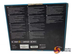The rear of the box has a bullet point list of key specifications in multiple languages.