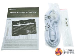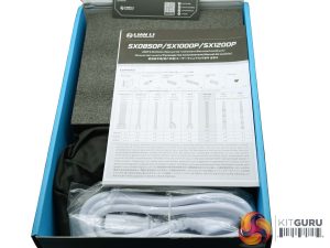Inside the box there is some literature on the power supply, and the unit itself is shipped between two soft pieces of foam. A white power cable is placed beside the cable bag. Lian Li also include some white cable ties, cable combs and mounting screws.