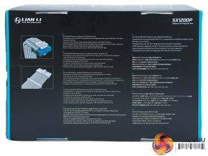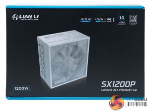 The Lian Li SX1200P arrives in a box with a high resolution image of the power supply on the front. We did get a white version of the unit, so I wonder if Lian Li have two boxes for each colour. The front of the box highlights key features, such as ATX 3.1, PCIe 5.1, 80 Plus Platinum certification and the 10-year warranty terms.