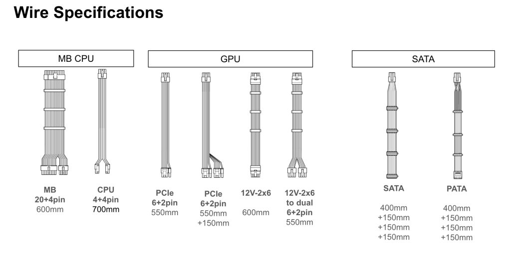 The MB 20+4 pin cable is 16-22 AWG, the CPU 4+4 pin is 16 AWG, the GPU 12v-2×6 (600w) cable is 16 AWG and the SATA cables are 18 AWG.