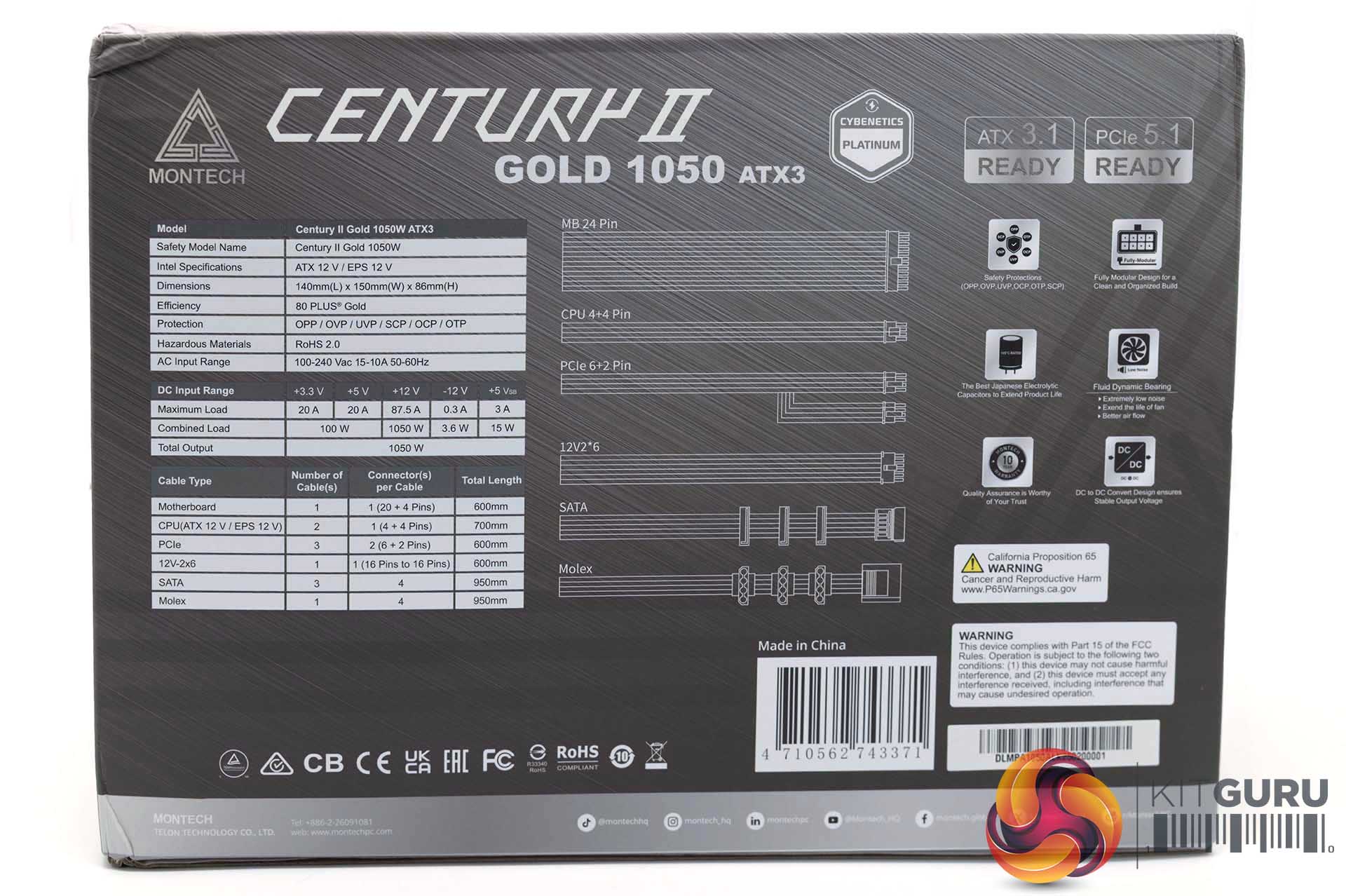 The rear of the box showcases more details of the PSU, including the capacitors, FDB fan, modular bay and the cabling. Montech seem keen to reinforce the Cybenetics certification again as the logo makes a reappearance on the back.