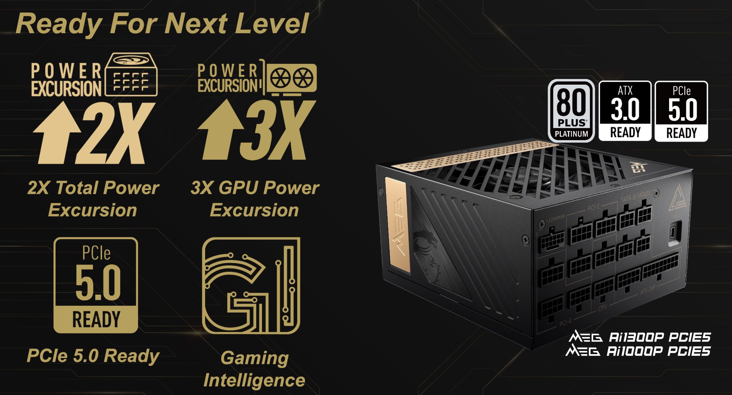 It has been some time since we have analysed a power supply from MSI, and today we are happy to check out their latest Platinum rated fully modular unit, the Ai1300P – priced at around 360 euros. This power supply is ATX 3.0 and PCIe 5.0 ready and MSI say it has 3x GPU power excursion and 2x total power excursion capabilities with a 600W native 16 Pin (12VHPWR) cable included.
