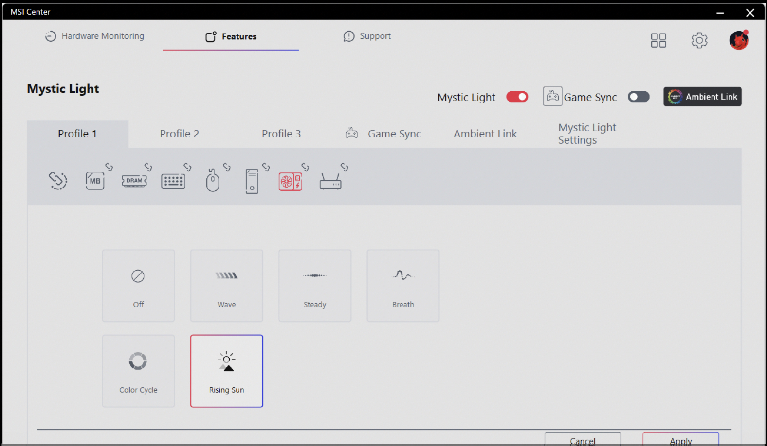 Of course as this is MSI they give you control over the ‘Mystic Light' effects. You can even use a ‘Rising Sun' profile which (in their own words) ‘Delivers a stunning display of radiance and beauty that elevates your setup'. Ok, then.