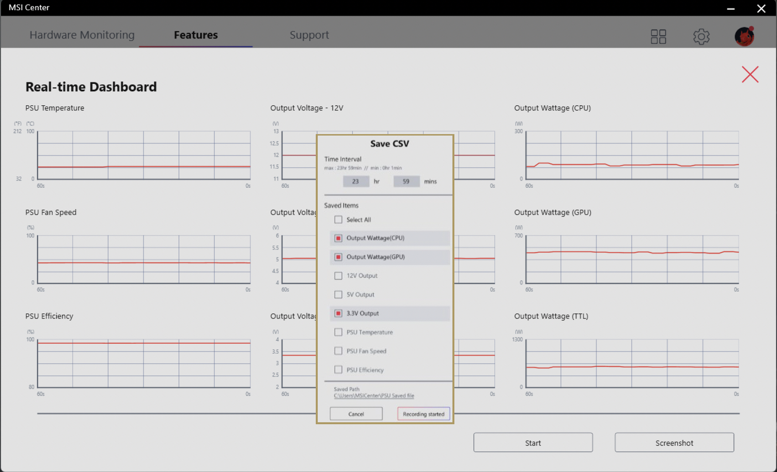 As previously mentioned you can connect this power supply to your system motherboard via a supplied USB C cable. If you install MSI Center the software gives you a real time dashboard system to adjust and play with settings. This shows you real time power supplied to the GPU and CPU and total system wattages. You can also record this data if you need to log the information.
