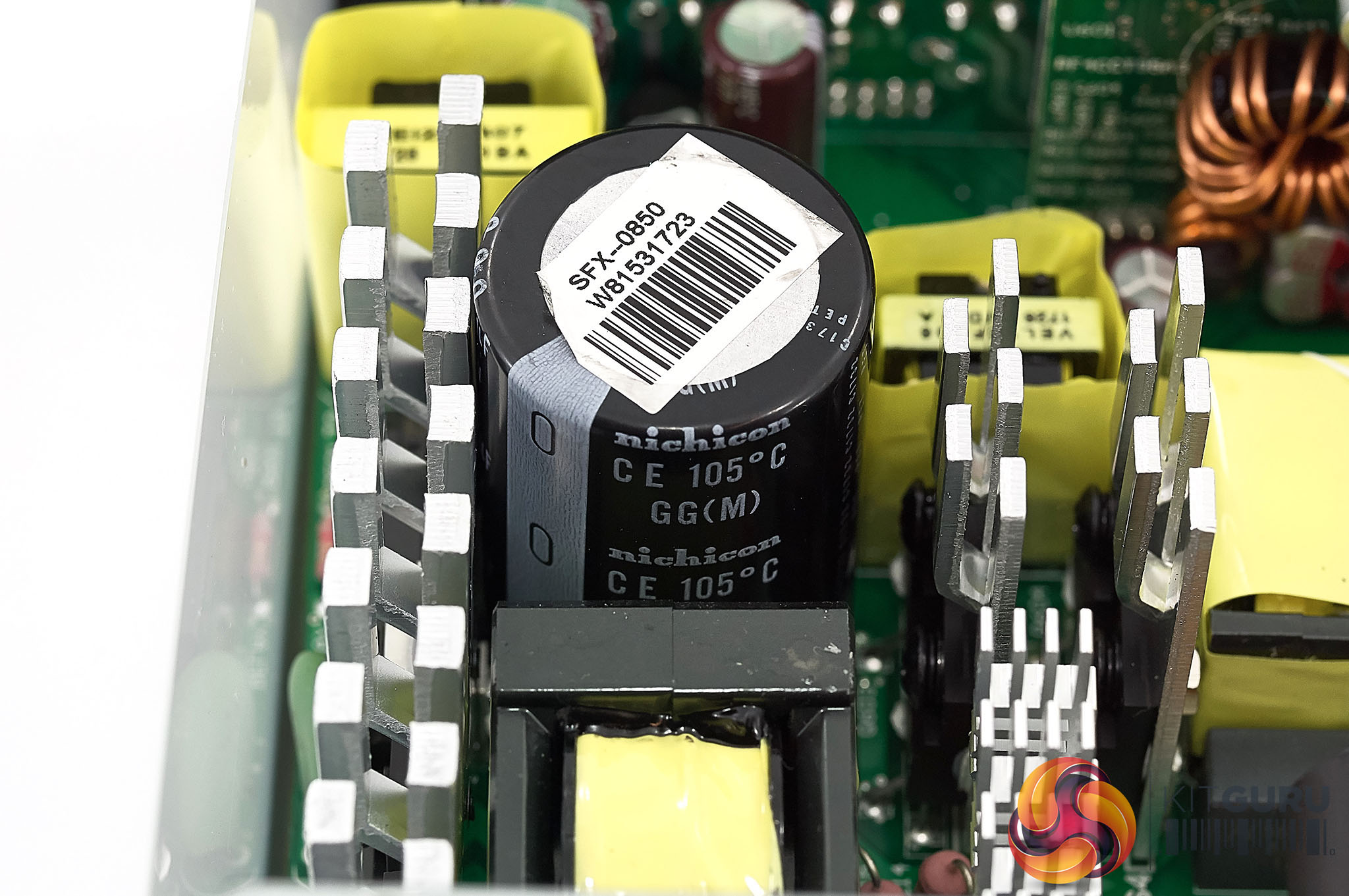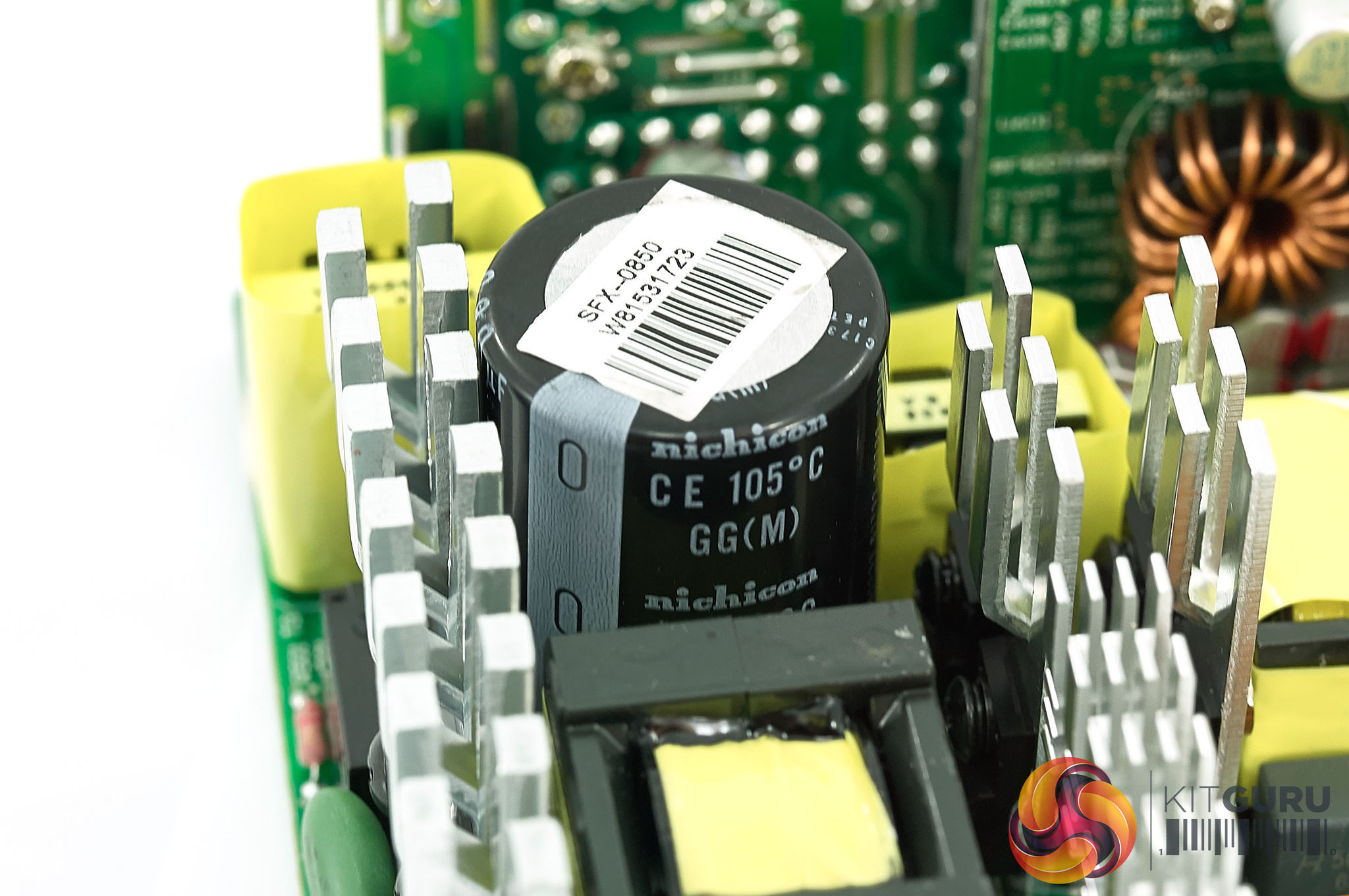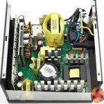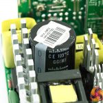 Seasonic are using high grade Japanese capacitors throughout the build with a single 105c rated Nichicon capacitor positioned in the primary stage. This is rated 400v 650uF. Interestingly Seasonic have adopted two primary capacitors in their earlier higher cost PRIME units. The Prime 850W Platinum for instance uses two Nippon Chemi Con capacitors at 400v 330uF each, for a total of 660uF output. The Seasonic Titanium 850W unit is ridiculously over specified – fitted with two Nippon Chemi Con 650uF and 450uF capacitors to output 1100uF!
