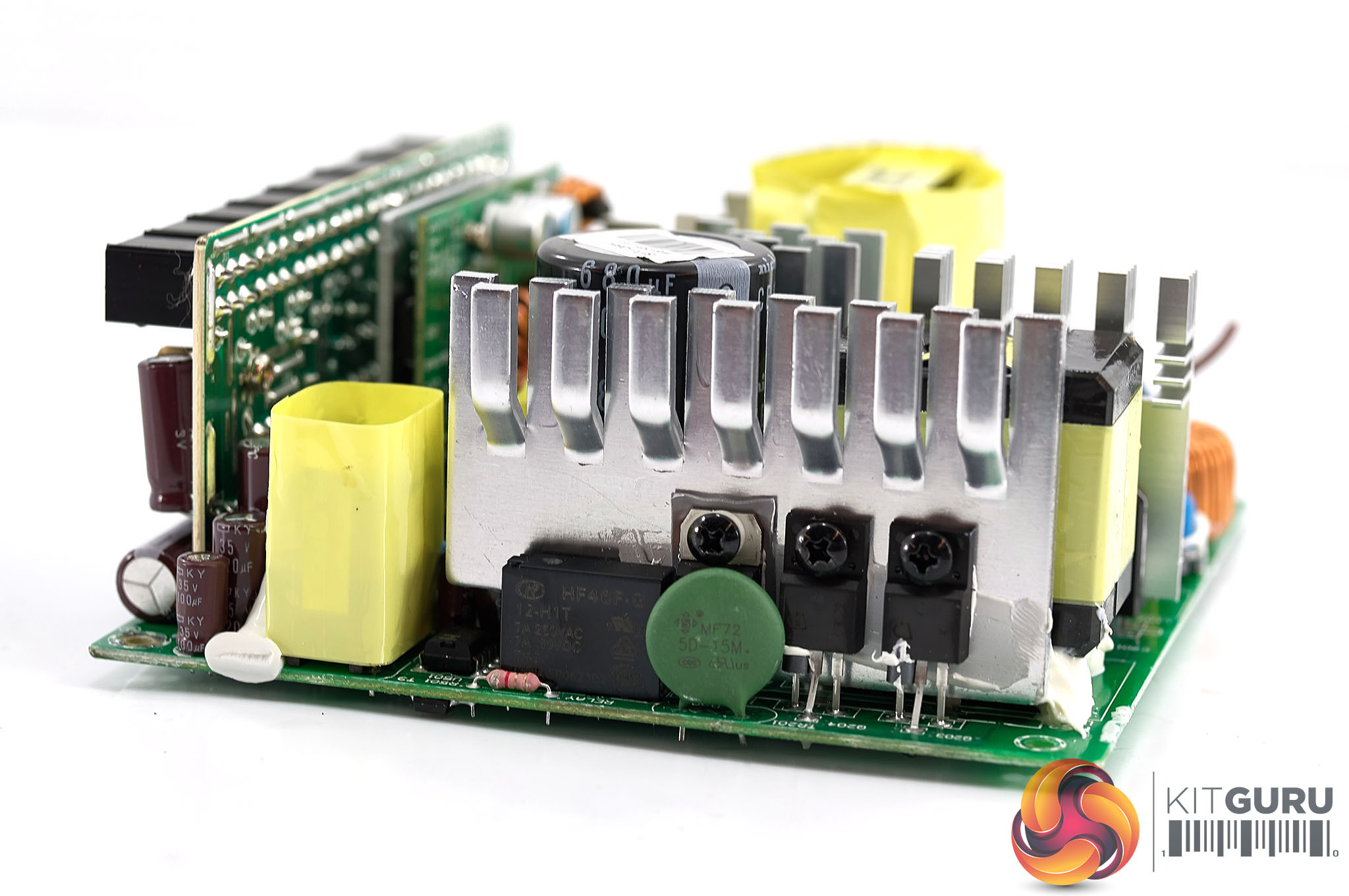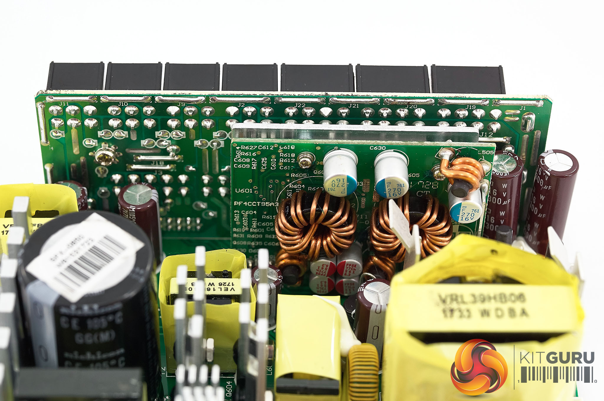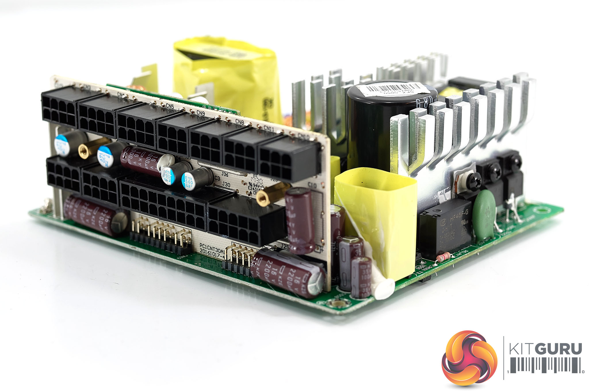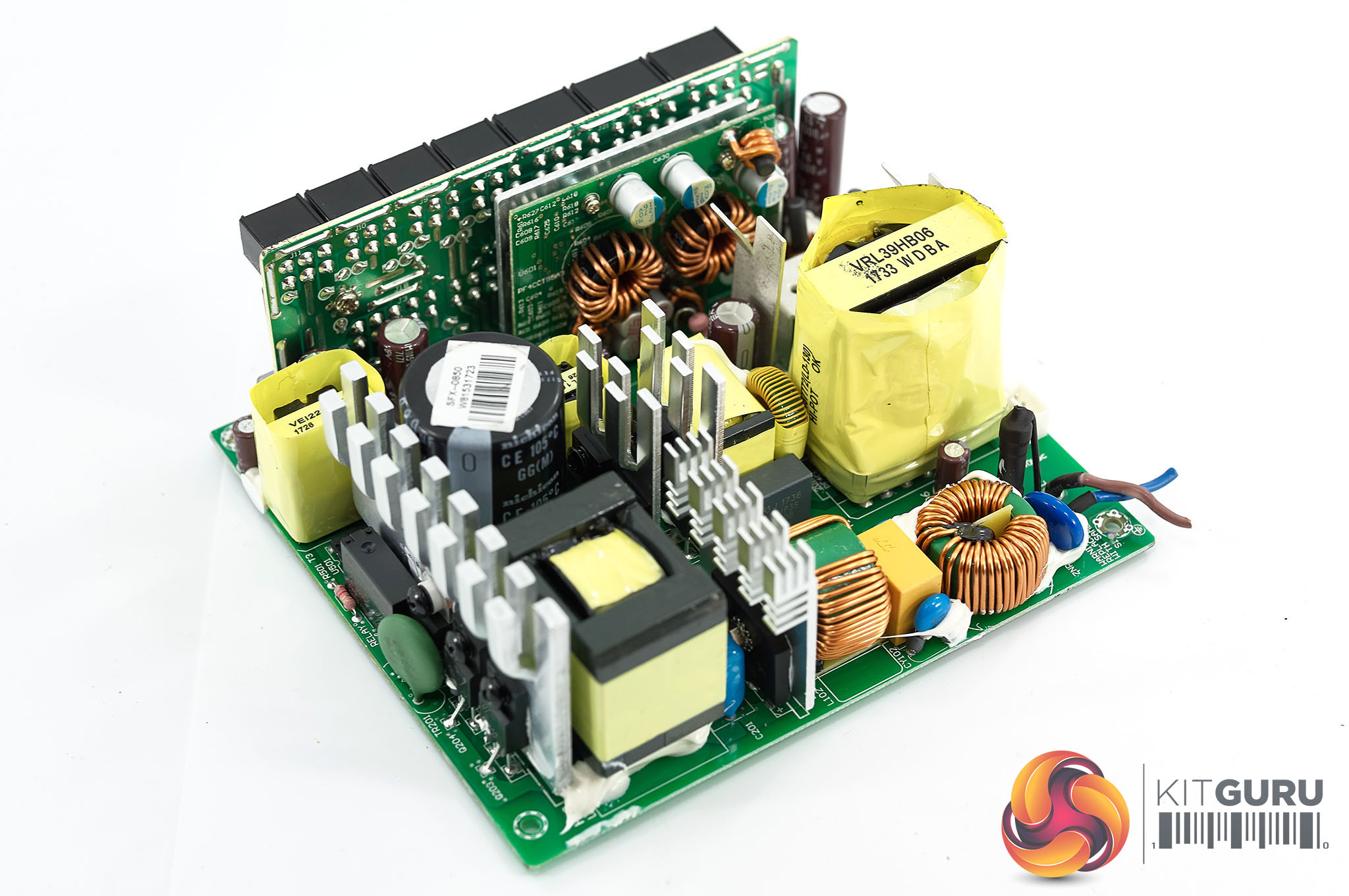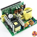 Inside are a fair few smallish heatsinks to aid with cooling key components. The power supply is using a full bridge LLC topology with synchronous rectification with DC-DC VRM’s for +3.3V and +5V rails on secondary.