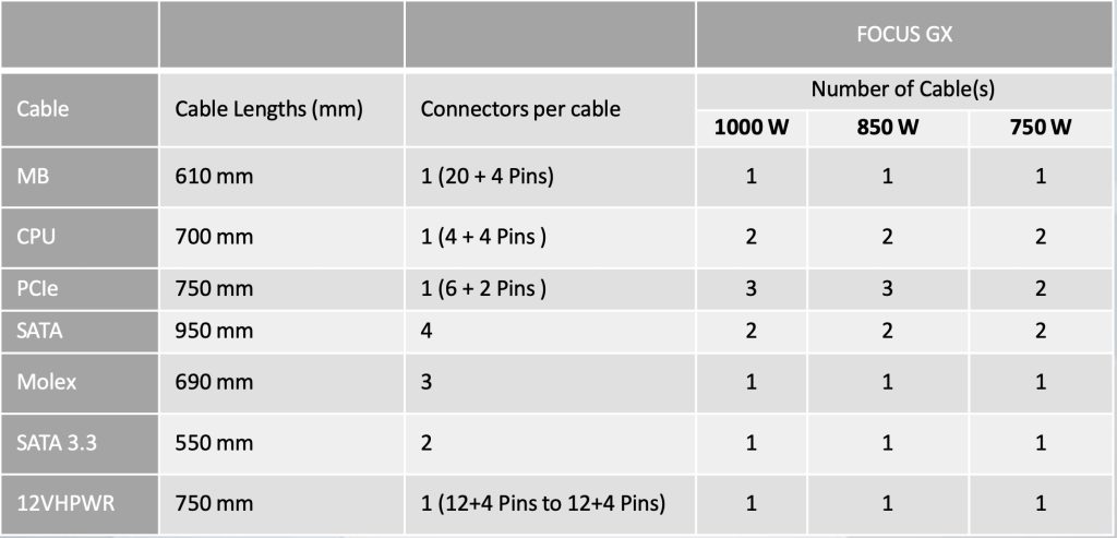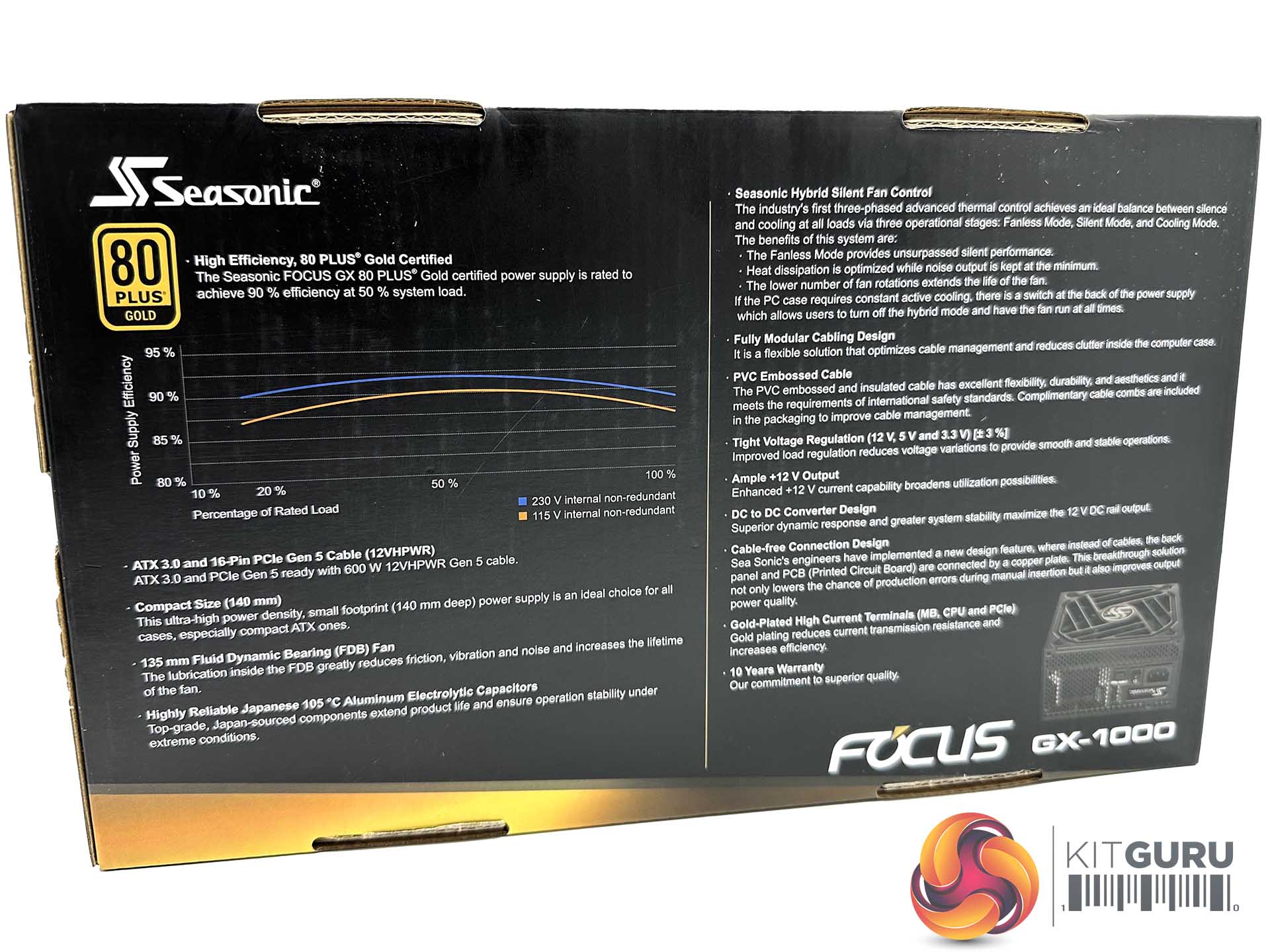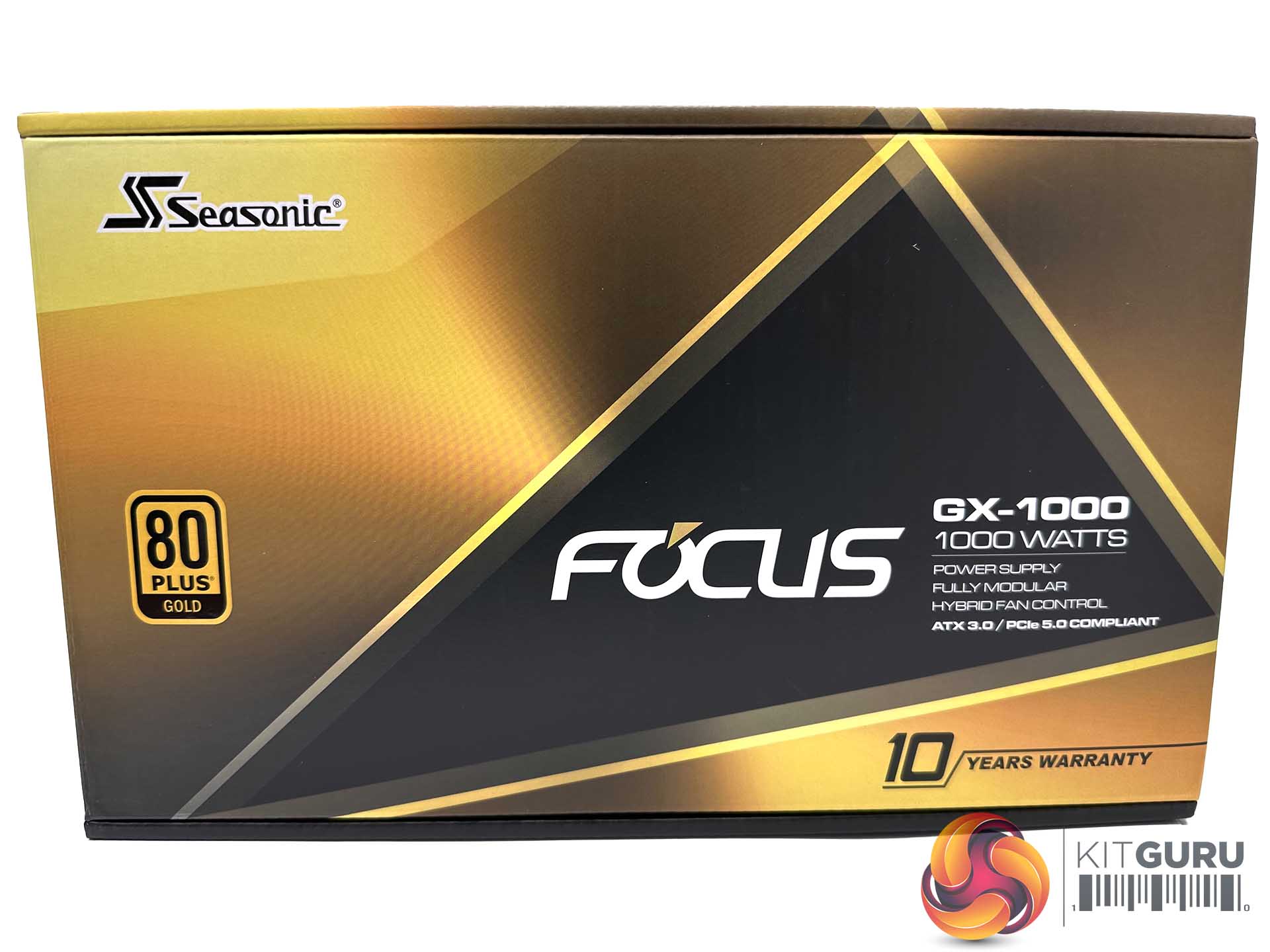 The Focus GX-1000 power supply ships in a bright gold coloured box with no image of the unit on the front – just a list of key specifications along with the 10 year warranty.