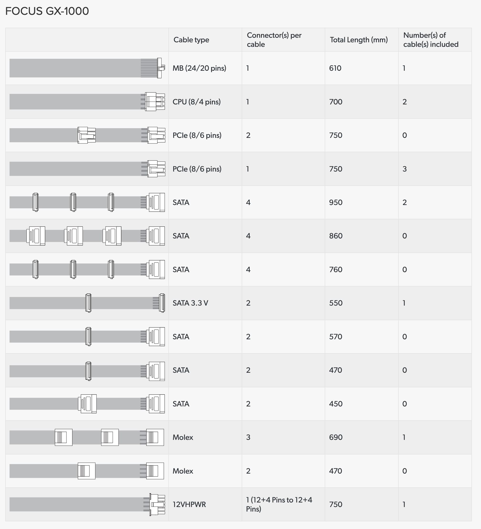 The cables supplied in the box are all individual sleeved and look fantastic. Ideal for a custom build where they are on show. Seasonic even show how they advise the 12VHPWR CABLE to be installed. The 1000 Watt supply has plenty of cables for a high end system build.