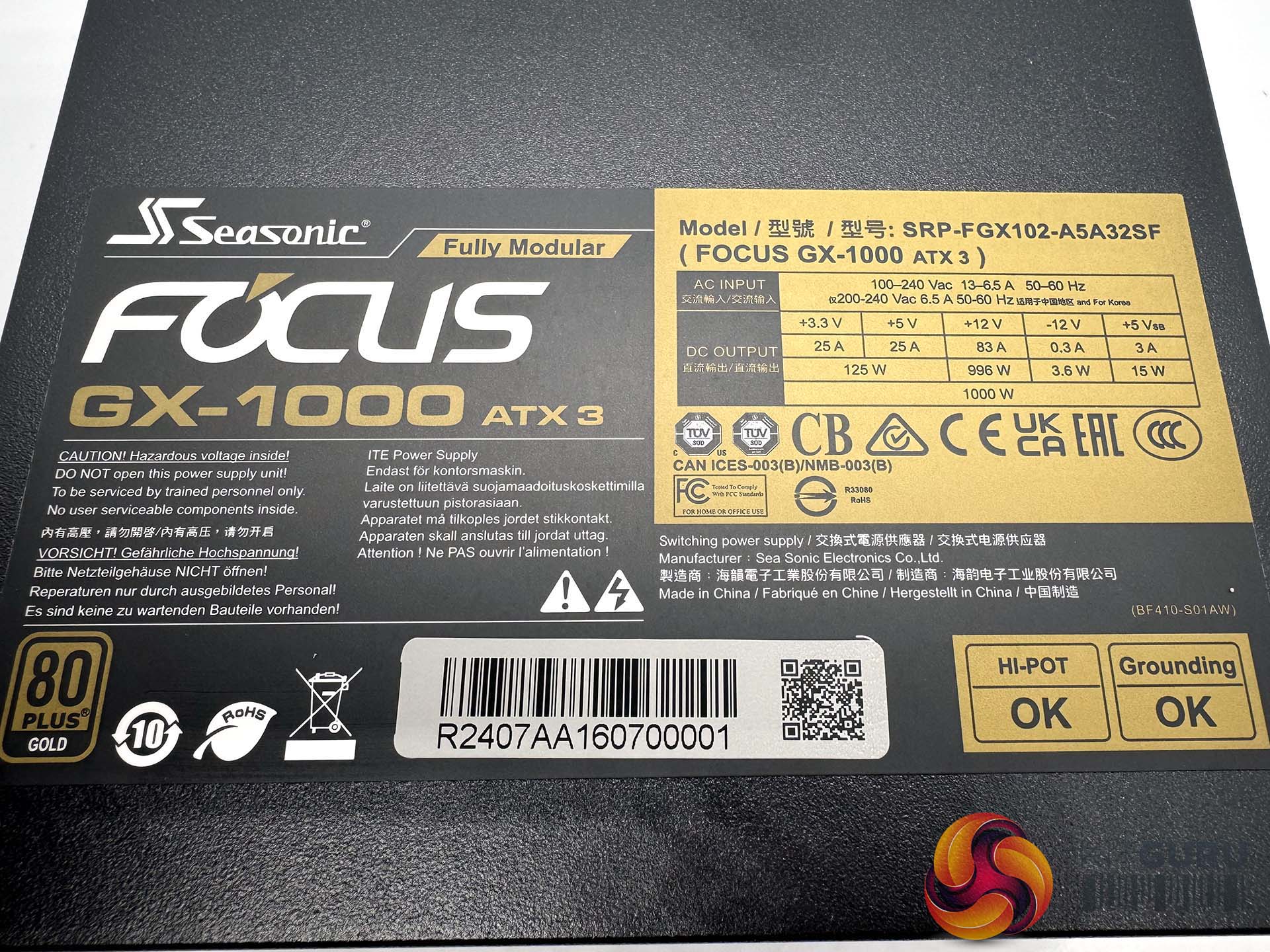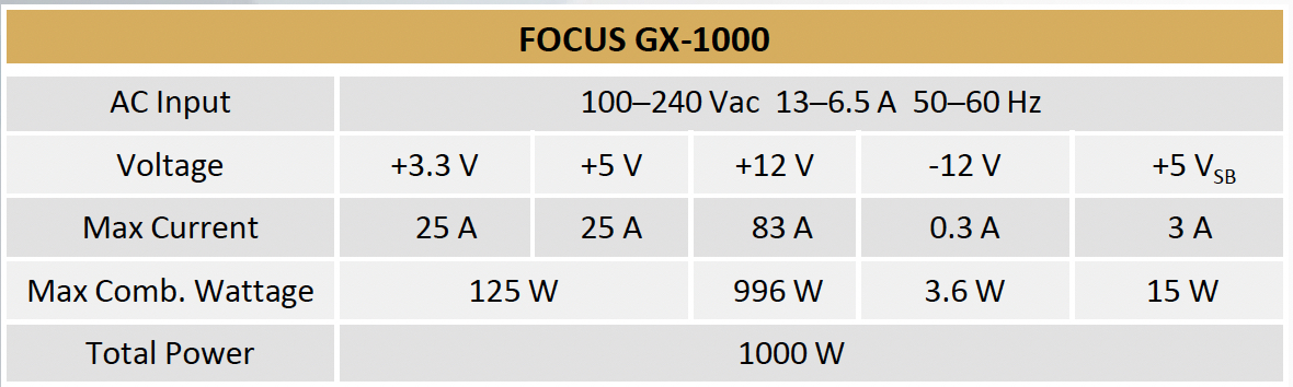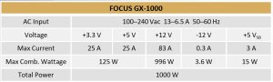 This 1000 Watt unit is able to deliver 83A via the +12V rail for 996W of the total power output. Seasonic have set the minor +3.3V and +5V rails at 25A.