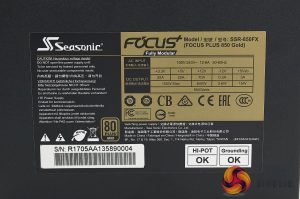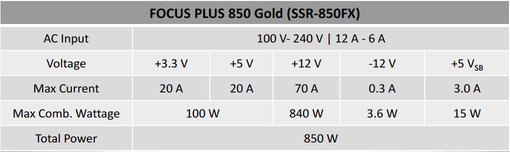 The power supply has a 12V output up to 70A, which is around 98.8% of the units total capacity. Each of the minor rails (3.3V and 5V) have a capacity of 20A with a combined rail output of 100 Watts. This is a fairly standardised set of figures from Seasonic based on all of the 850 Watt units I have reviewed from them in recent years.