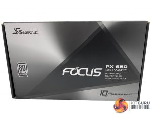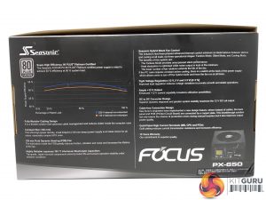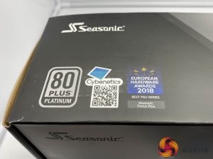 The Seasonic box artwork is very simple, yet effective. No image of the power supply on the front, which means they can use the same box artwork throughout the range. We can see the 80 Plus Platinum certification and their 10 year warranty bottom right.