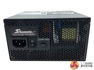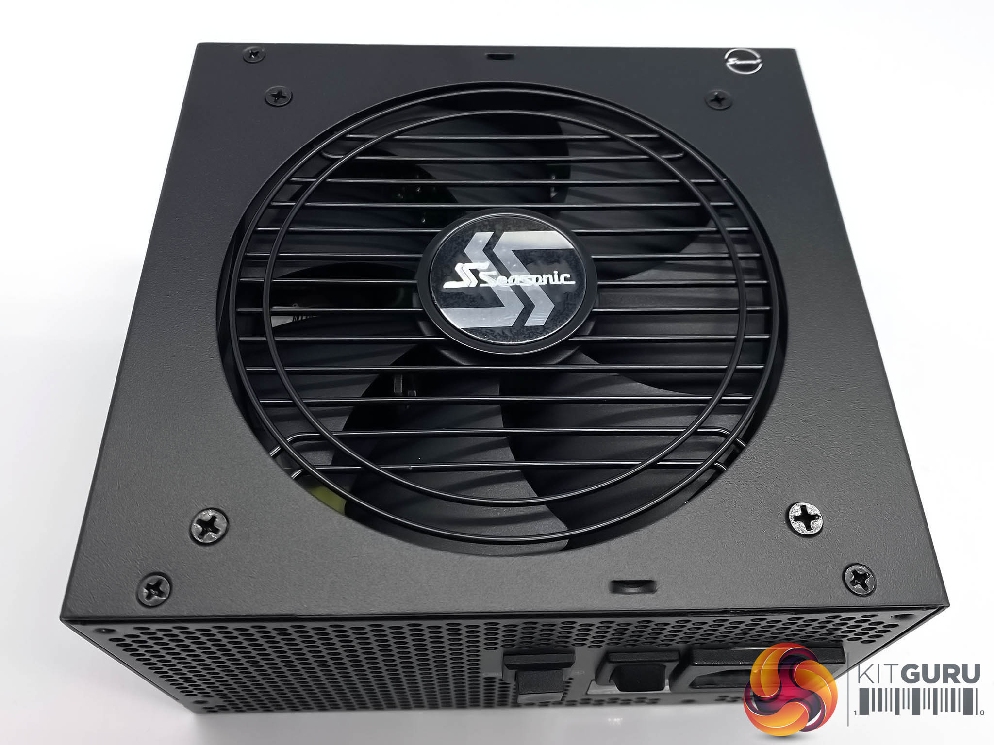 The top of the power supply hides the FDB fan underneath a metal grille. The Seasonic logo is shown in the centre of the fan. We will take a closer look inside later in the review when we crack the unit open.