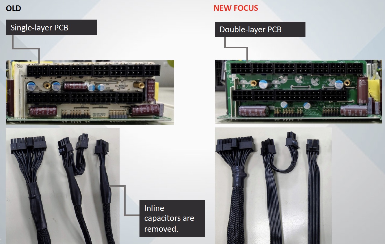 We can see that the new Focus units are using a double layered PCB on the modular daughter-card and they have removed in line capacitors on the cables. Due to the high efficiency Seasonic don't need to overpopulate the PCB with many heatsinks.