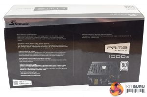 Seasonic PRIME box artwork is very reflective and quite difficult to photograph. The front of the box highlights the model and capacity, along with the 80 Plus Platinum certification and 10 year warranty. This 10 year warranty is actually now 12 years however (HERE), so Seasonic could do with updating their box artwork.