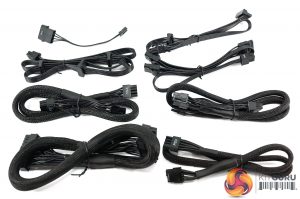 The Seasonic power supply is a pure modular design. The cables are a mixture of sleeved (ATX, CPU and PCIe) and flat ribbon style (peripherals), for ease of routing.