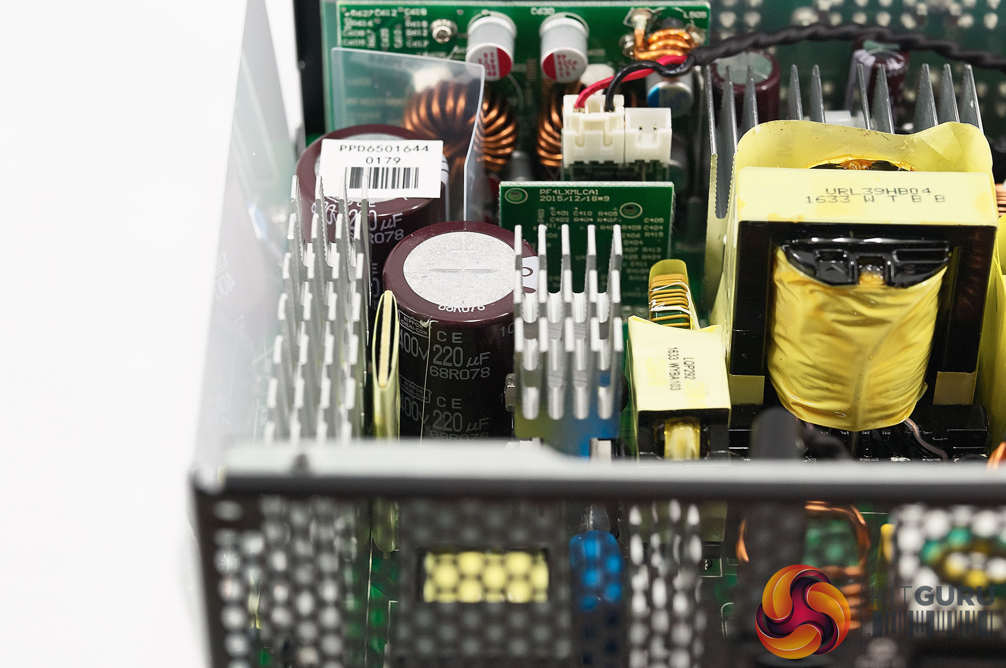 The two primary Nippon Chemi Con capacitors are 105c rated and 400v 220uF to produce a total of 440uF. Checking back with our review of the Titanium PRIME 650W power supply from August 2016, we can see Seasonic massively over specified that unit, with two 450uF primary capacitors in the design to deliver a total of 900uF!