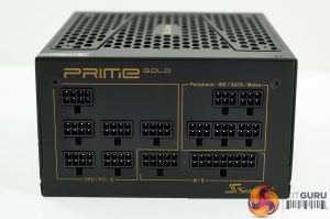 One side of the PRIME Gold unit is home to all the modular cables. The main M/B connectors are indicated along the bottom of the panel and are clearly labelled. The Peripheral/SATA/Molex connectors are visible in a bank of two and three along the top right side. On the other side are all the CPU and PCI-e connectors in a row of 1, 3 and 2 from top to bottom (6 in total).