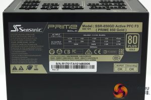 Above we can see the specifications of the power supply. The Model number is SSR-850GD Active PFC F3.