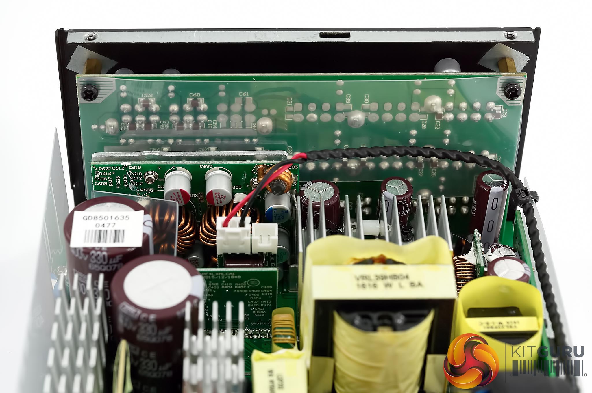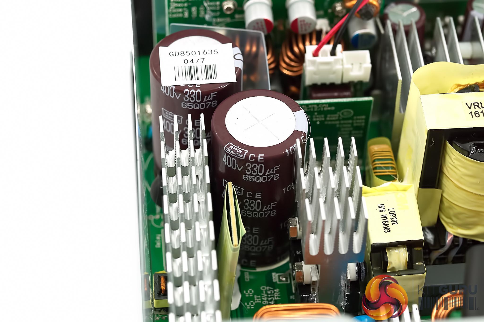 Seasonic use high grade 105c Japanese capacitors in both primary and secondary stages. The two main capacitors are rated 400v 330uF for 660uF total output capacity. The 1000W PRIME Gold unit has a 560uF and 470uF capacitor for a total of 1030uF.