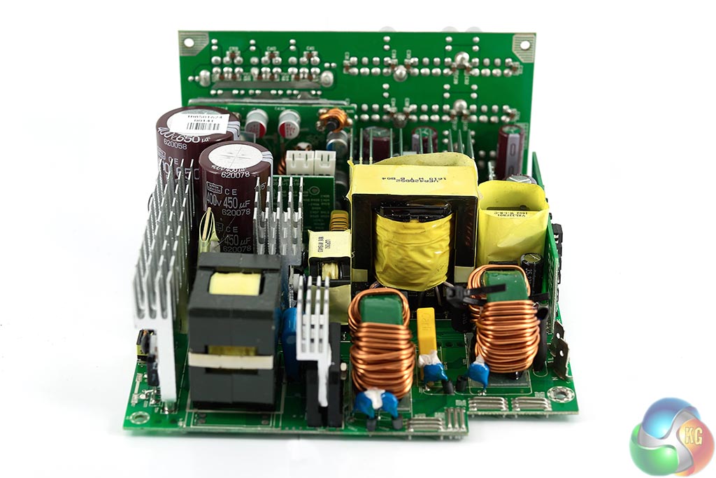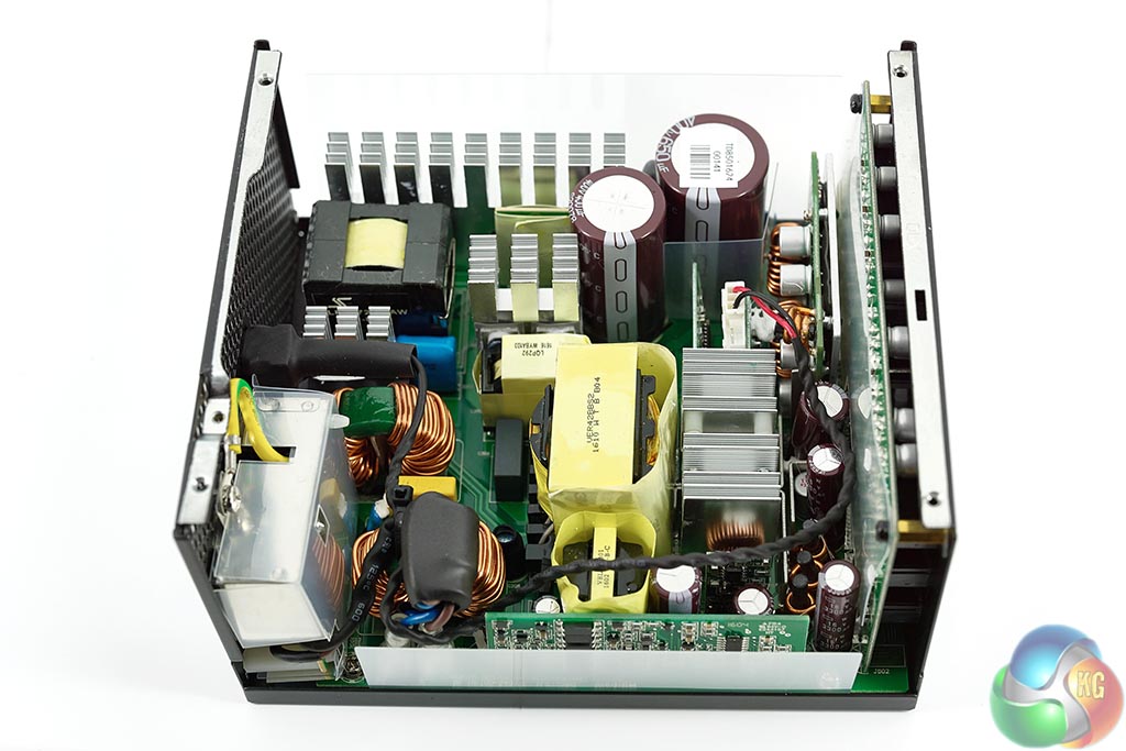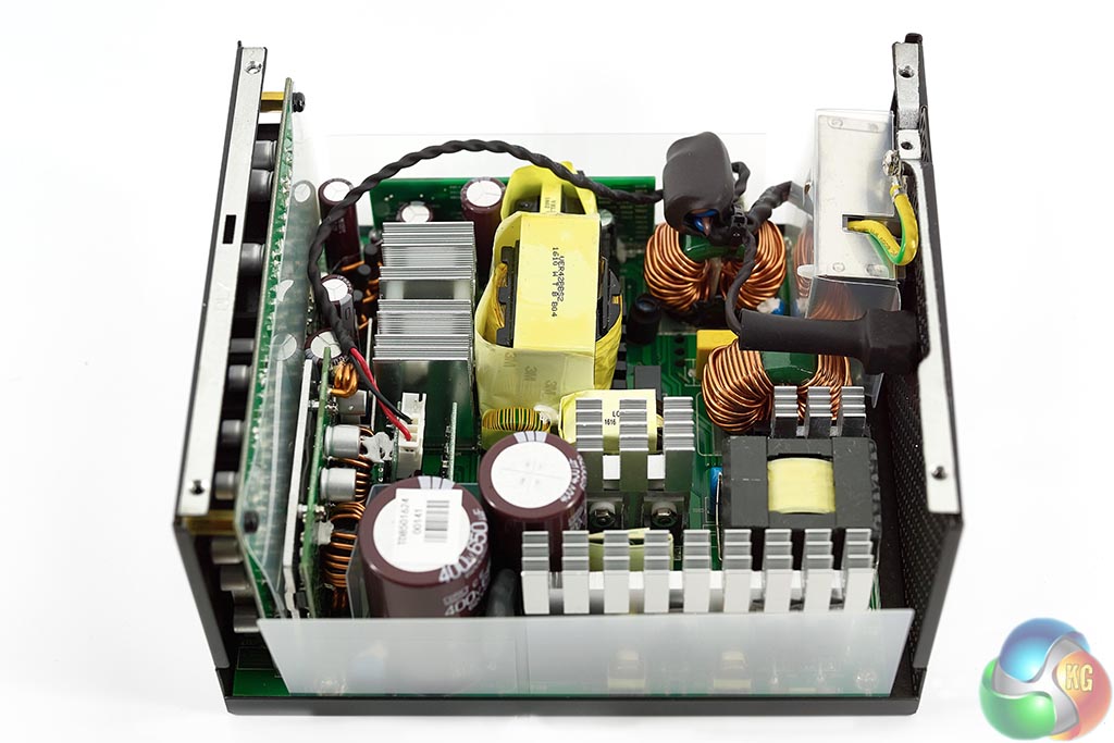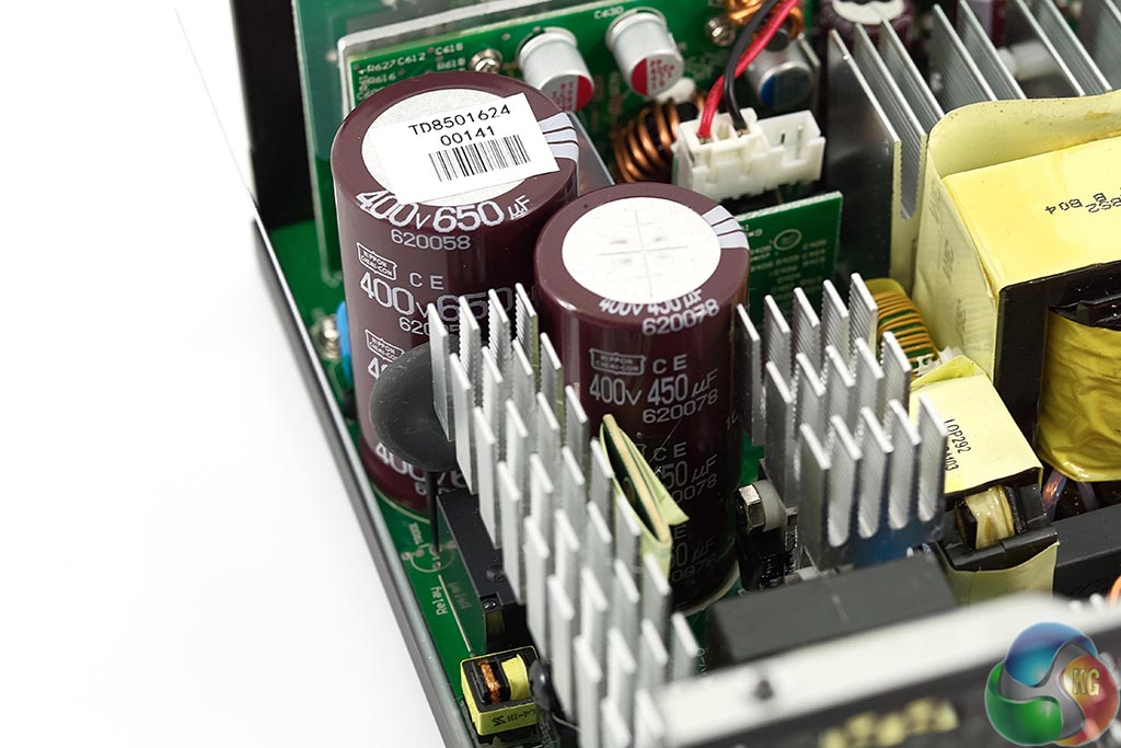 The 750W Prime which we reviewed last month is served by two 105c Nippon Chemi Con capacitors rated at 400v 560uF and 400v 450uF (for a combined total of 1010uF).