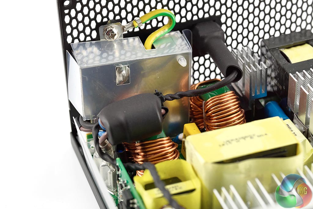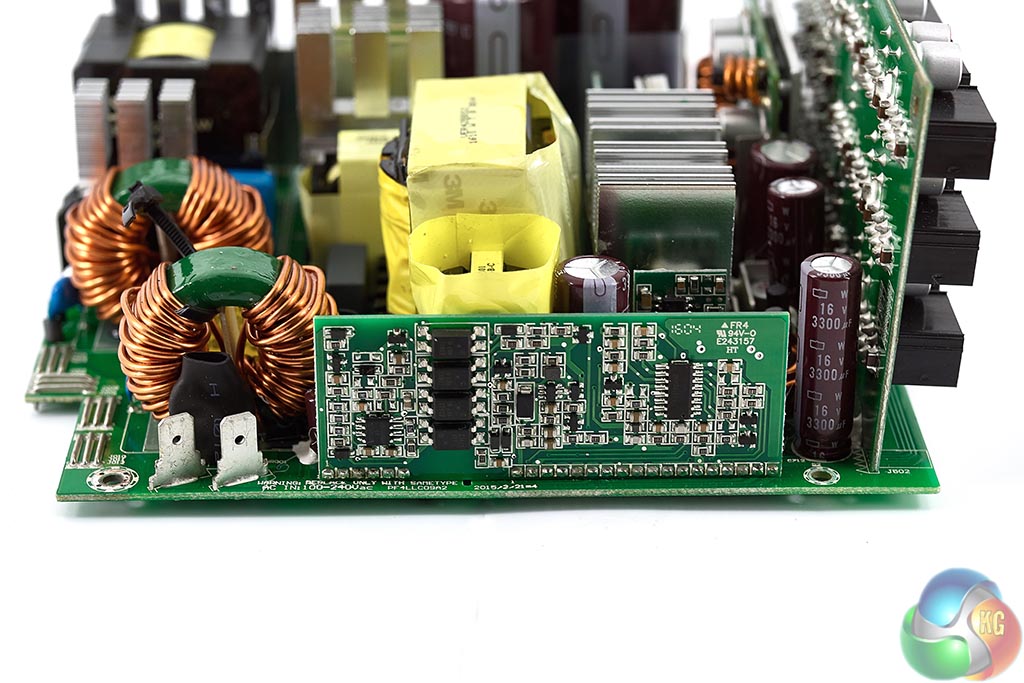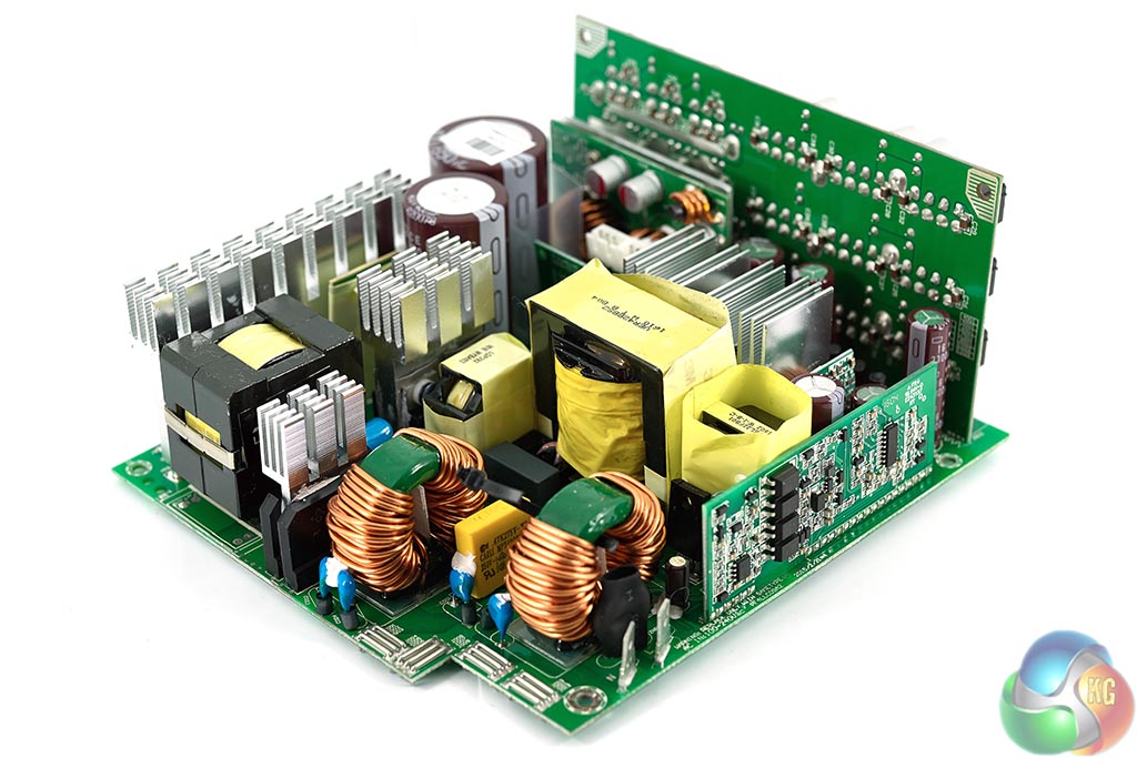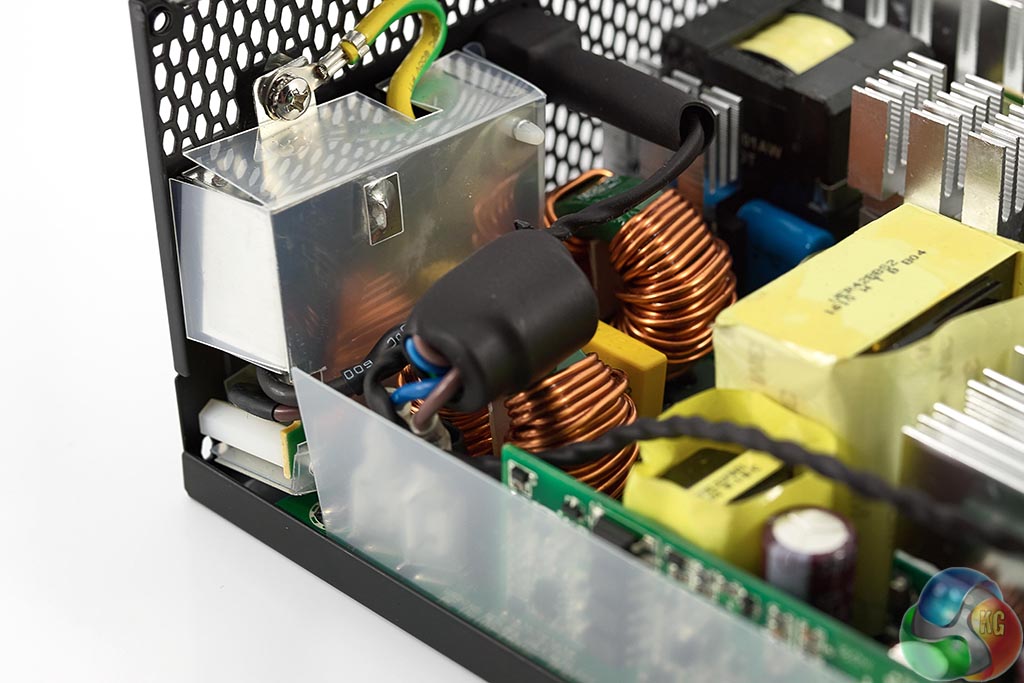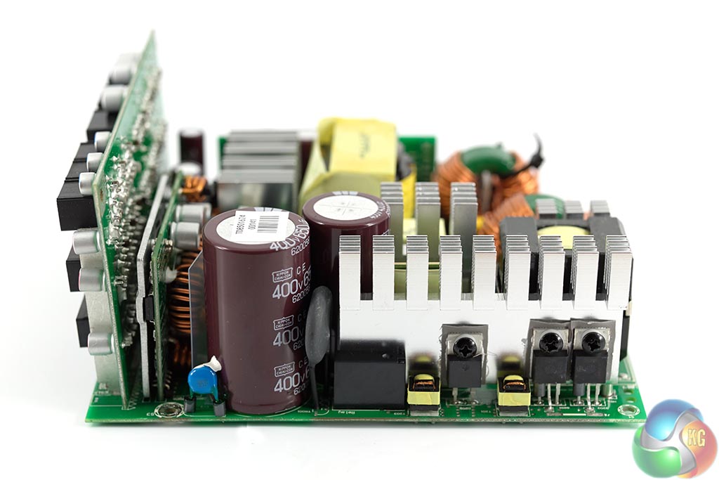 The 750W Prime which we reviewed last month is served by two 105c Nippon Chemi Con capacitors rated at 400v 560uF and 400v 450uF (for a combined total of 1010uF).