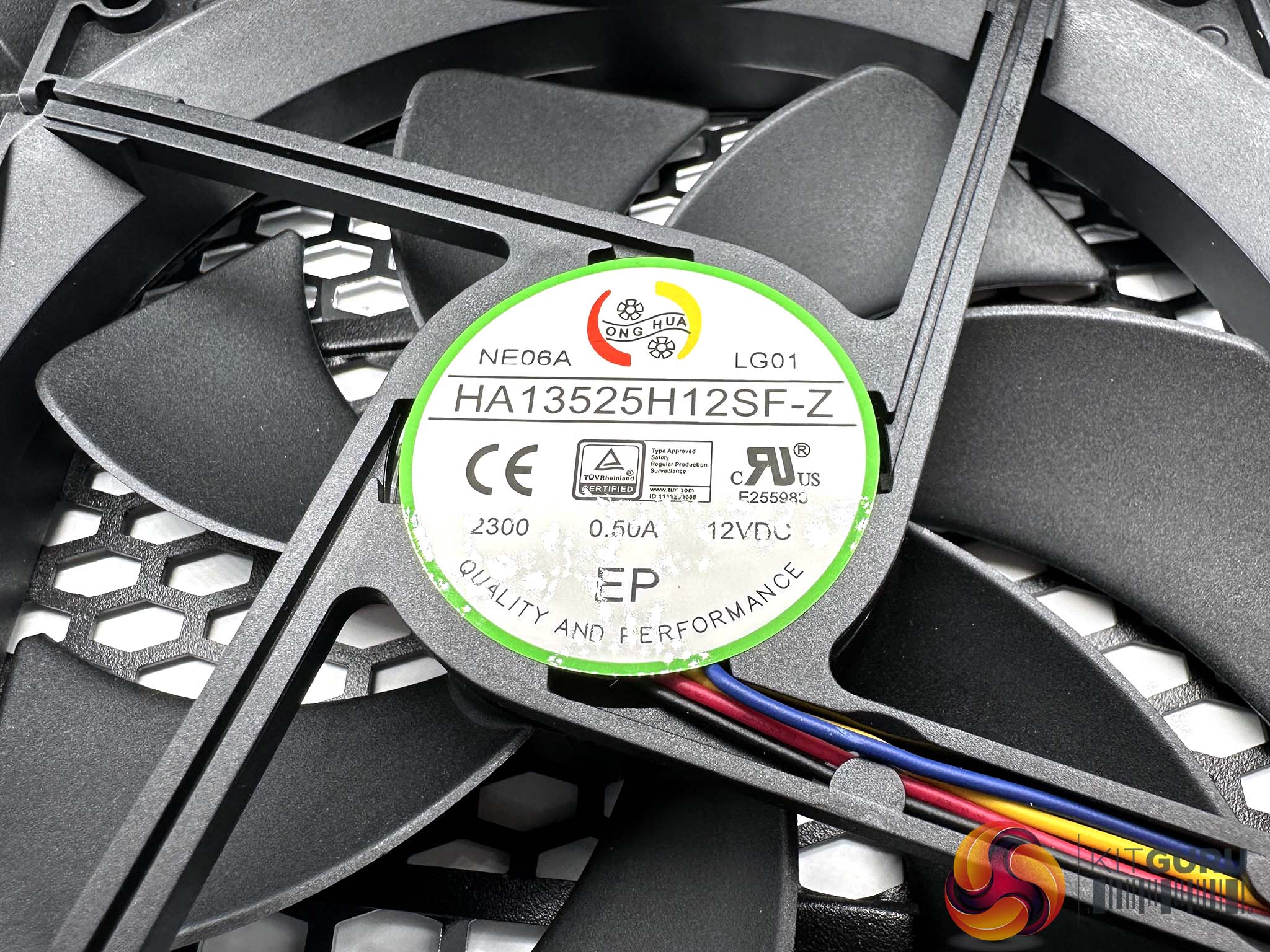 Inside the power supply is a Hong Hua fan, marked HA13525H12SF-Z – a favourite with Seasonic and many other brands. This is a 135 Fluid Dynamic Bearing (FDB) fan, which you can disable under lower load situations with the switch on the back of the unit.