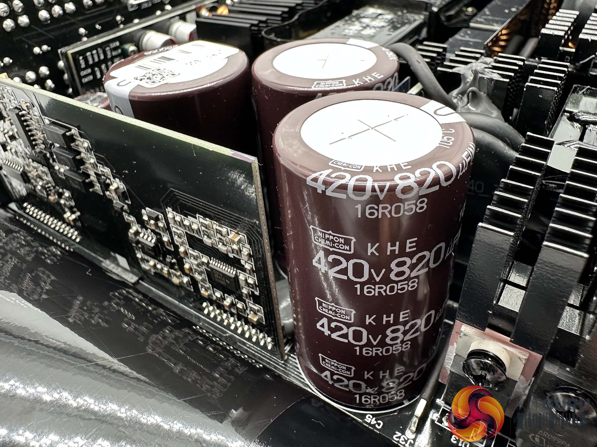 Seasonic are using high grade 105C Japanese capacitors throughout the design, with high grade Nippon Chemi Con caps making up the primary stage. Three massive 420v 820uF capacitors deliver a total of 2460uF. This is significantly higher uF than the 2022 version of this supply which we reviewed back in September 2022 (HERE). Due to this massive capacity we noticed Seasonic have used dual NTC thermistors with 20ohm x2 resistance. These are installed on a vertically mounted board into the main PCB to save horizontal foot print.