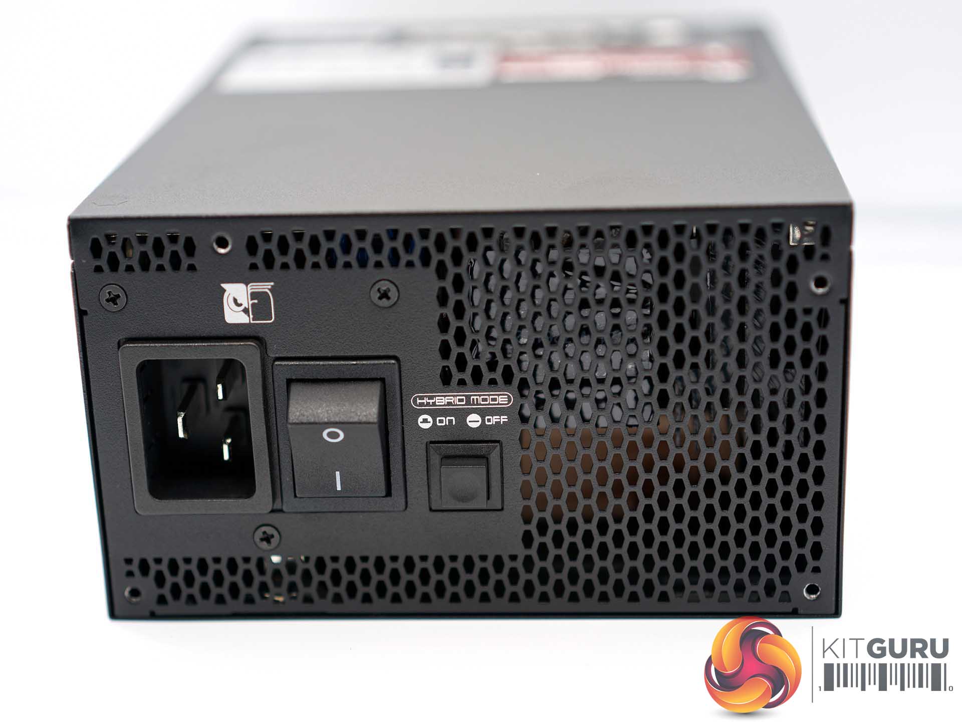 This side of the power supply is home to the power connector and switch. There is also a hybrid fan button – which allows you to disable the fan completely until a certain amount of demand is asked from the unit. Usually this is based on the ambient temperatures and up to 50% electrical load (around 800 watts).