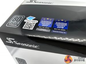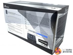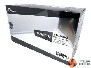Seasonic's Prime range of power supplies ship in a shiny silver box – to indicate the Titanium efficiency rating. Is it super reflective and a nightmare to photograph! On the front of the box there are some key specifications listed, along with the 12 year warranty rating.