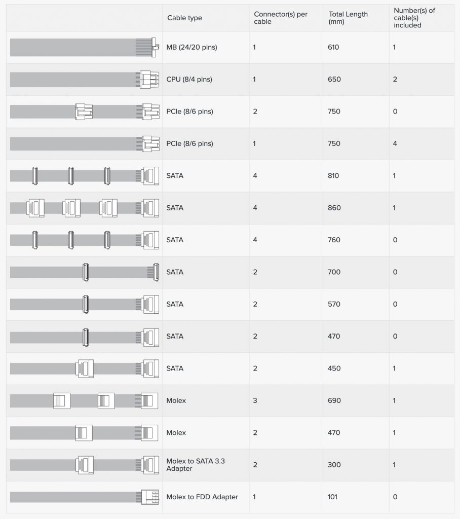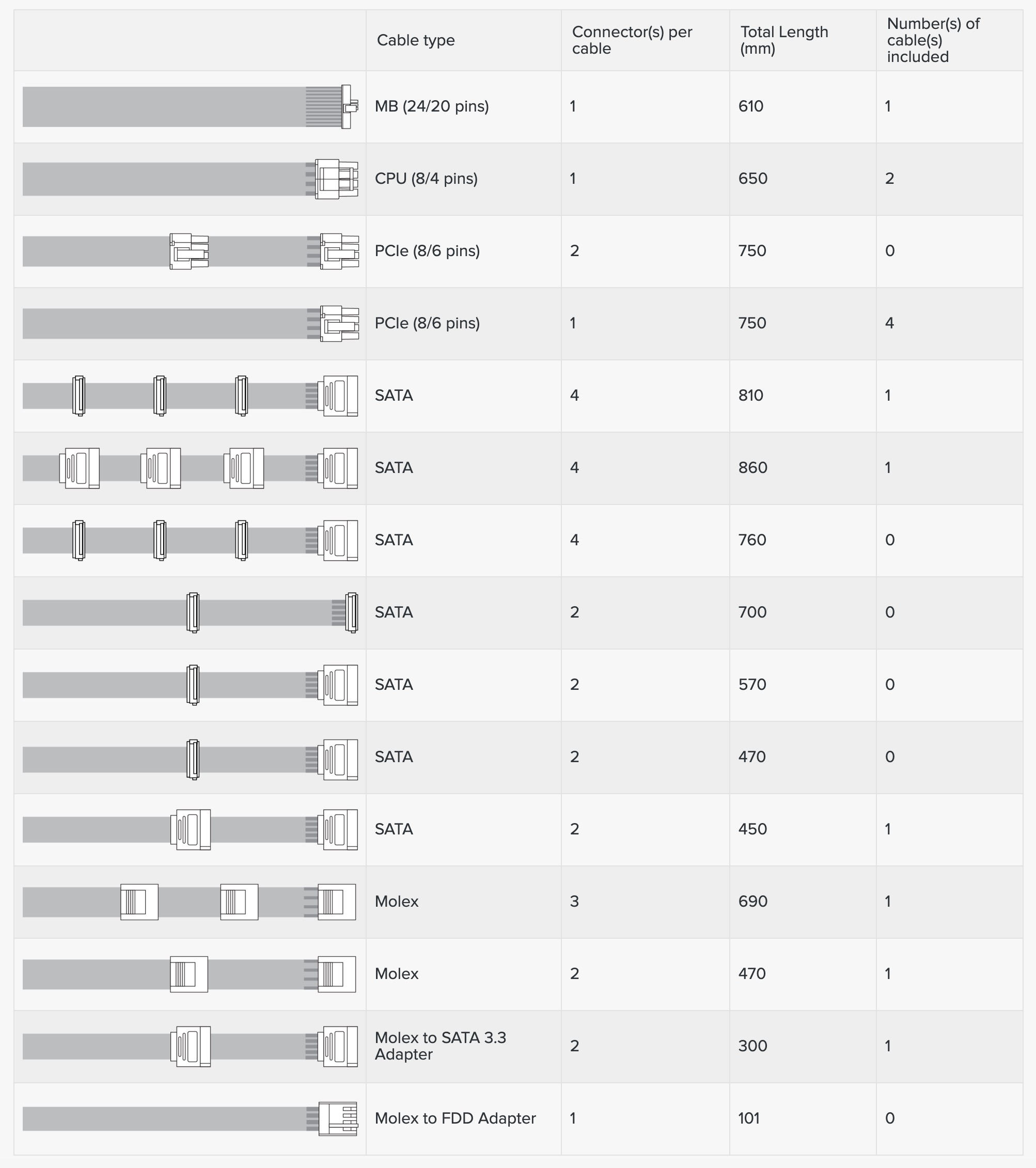 The modular cables are all flat ribbon style for ease of routing, apart from the main ATX cable which is sleeved. The new 650W model ships with two CPU power connector cables.