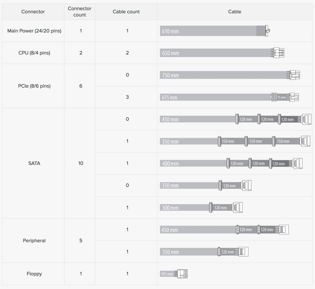 Seasonic supply 6 PCIe power connectors over 3 cables, to cover Crossfire and SLI builds or for those who use a lot of graphics cards for other duties. I would like it if Seasonic could make their CPU cables a little longer than 650mm- for those people with some of the larger cases on the market.