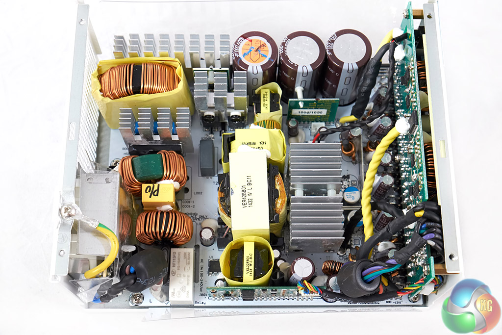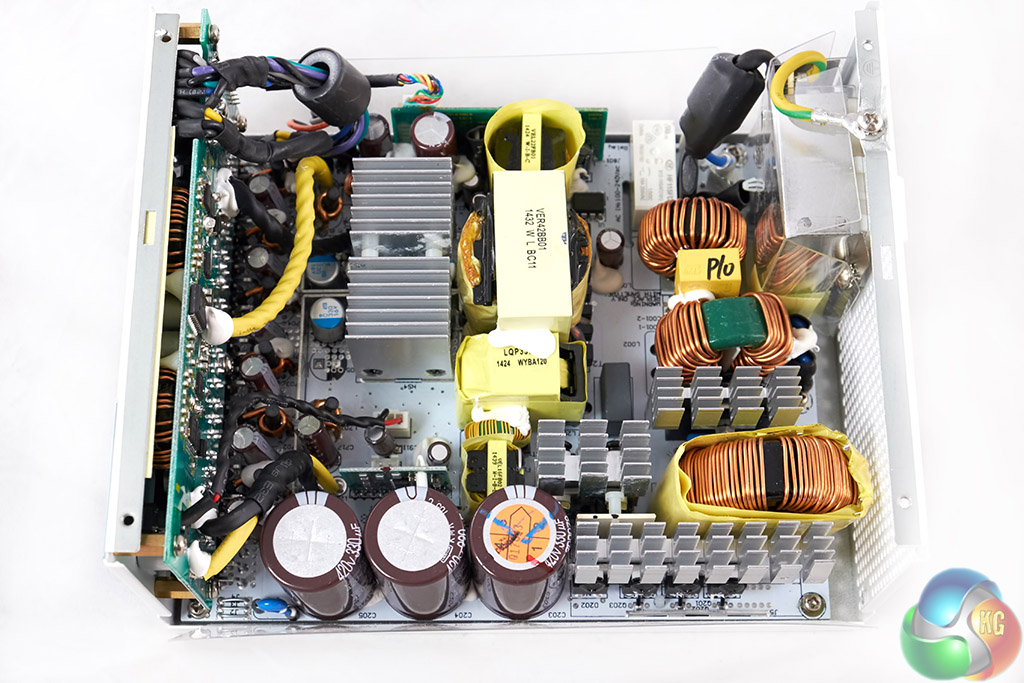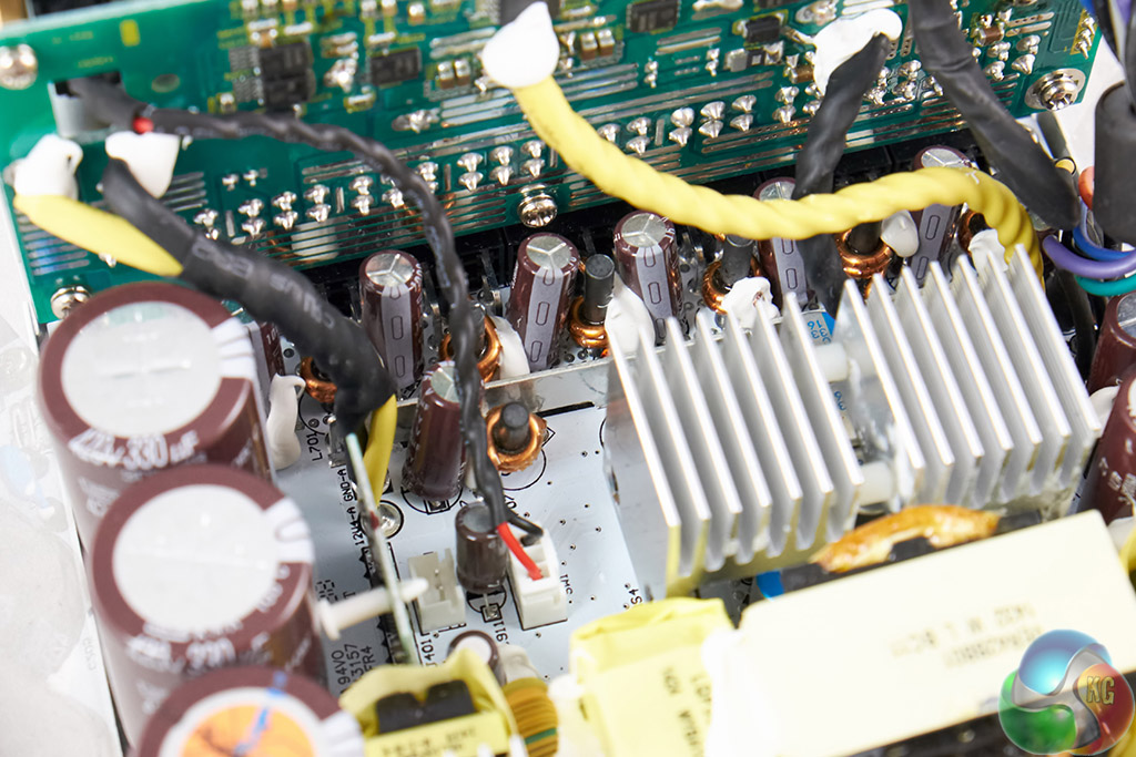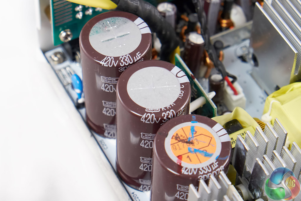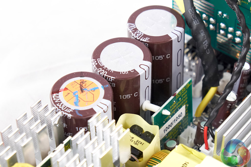 Seasonic are using three high grade Japanese capacitors on the primary stage (class leading ‘Nippon Chemi Con’). These are all 105c rated. All three are rated 330uF 420V. The Seasonic Platinum 1200W unit uses three more powerful 390uF rated capacitors in the primary stage, for those interested.