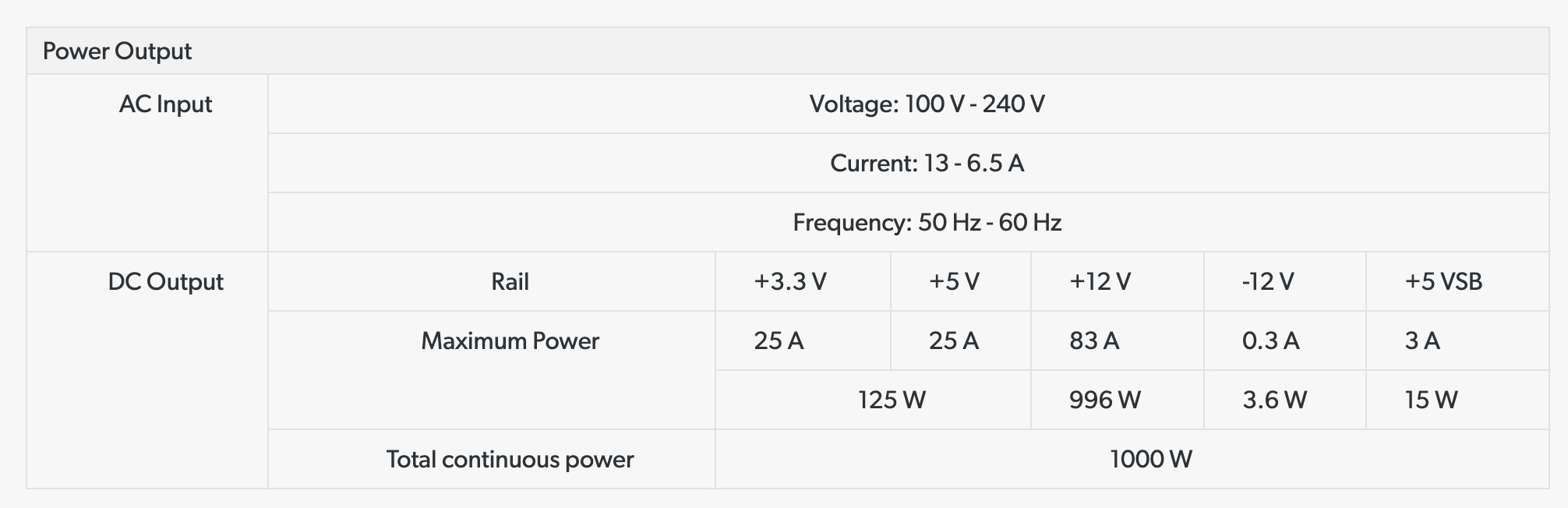 The unit can deliver 25A to the +3.3V and +5V rails. The +12V rail is rated to 83A at full load.