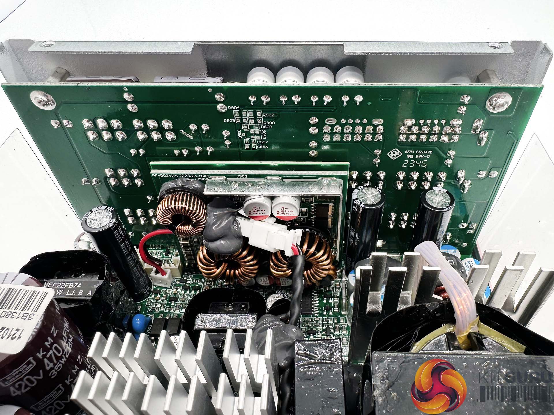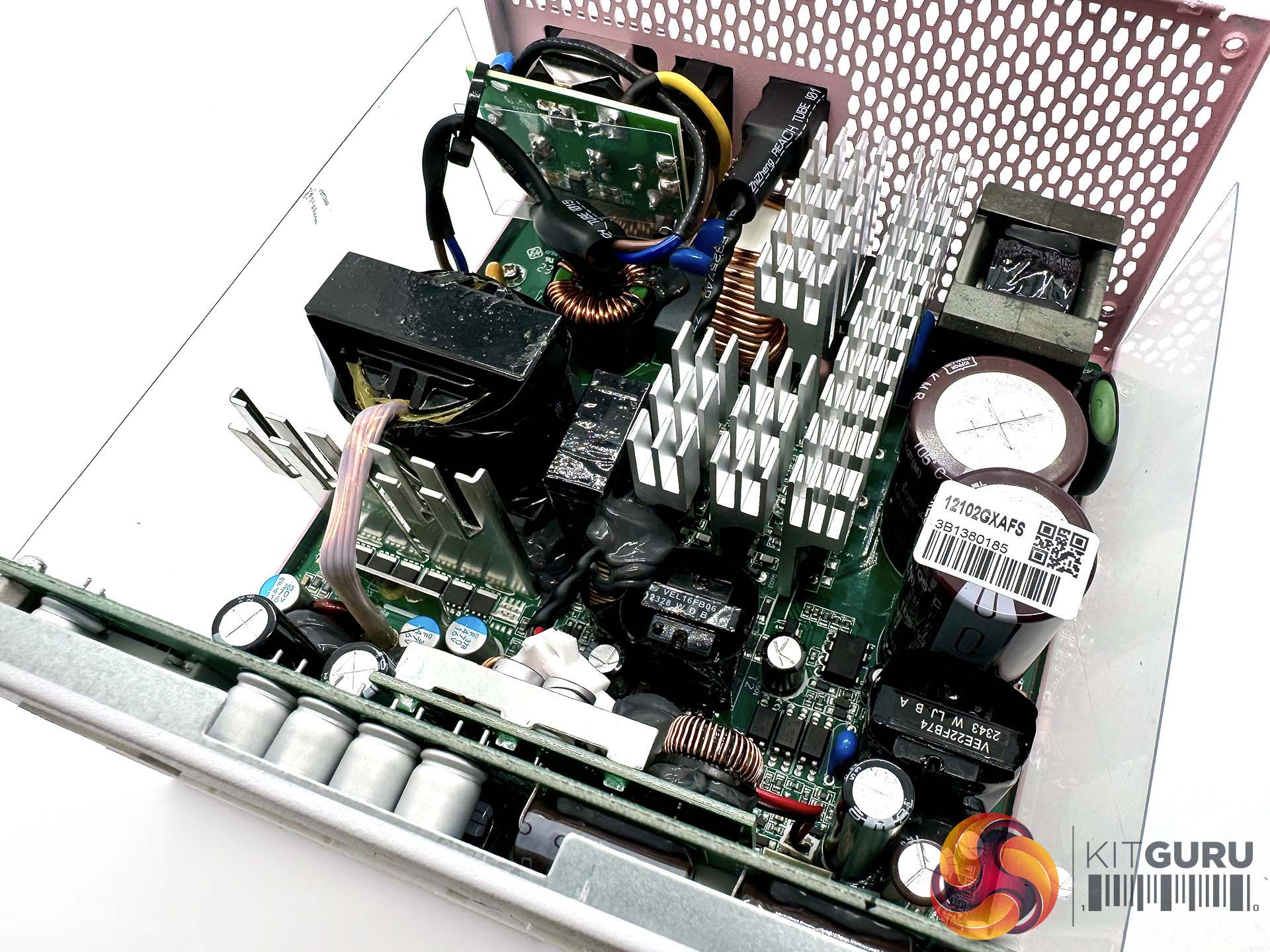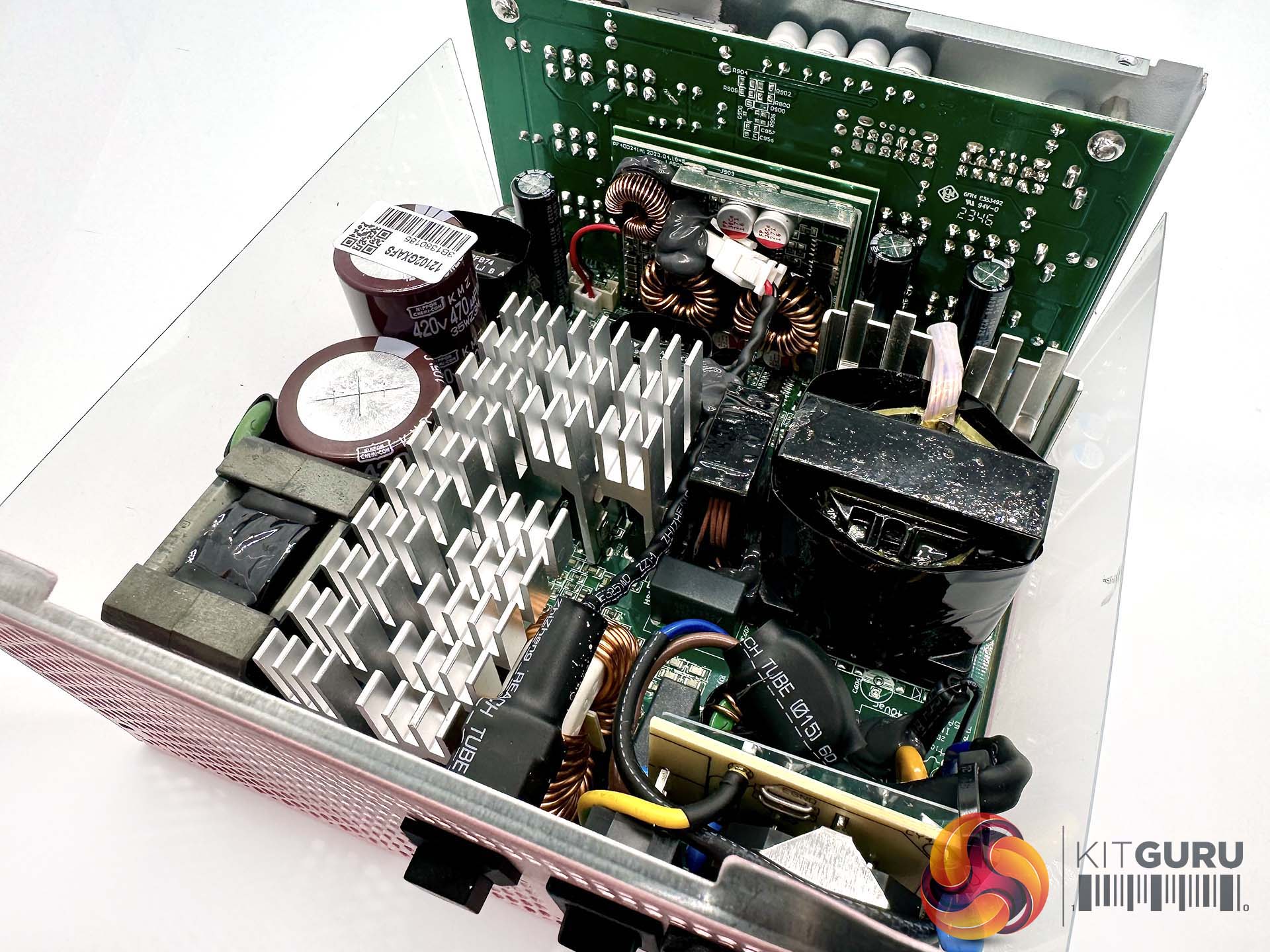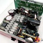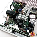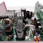 This is a fairly compact platform and as we would expect from Seasonic, its very well put together. There are a handful of large heatsinks and there appears to be adequate cooling for the 12V FETs. A full bridge topology is adopted for this design, along with an LLC resonant converter. A pair of VRMs generate the minor rails with eight FETs. The primary capacitors are high grade Japanese 105C rated KMR from Nippon Chemi Con – one is rated 420V 470uF and the other is 420V 390uF, for a total of 860uF.